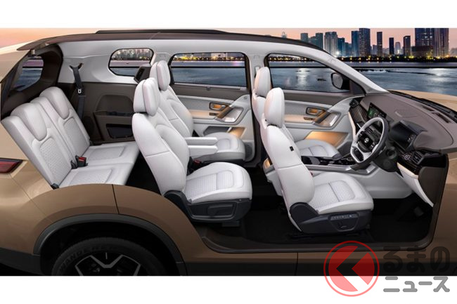 2列シート5人乗りのハリアーに対して、サファリは3列シート6人乗り(2-2-2)または7人乗り(2-3-2)になっているのが特徴です。タタSUVシリーズのフラッグシップという位置づけで、デザインも上質な雰囲気になっています。