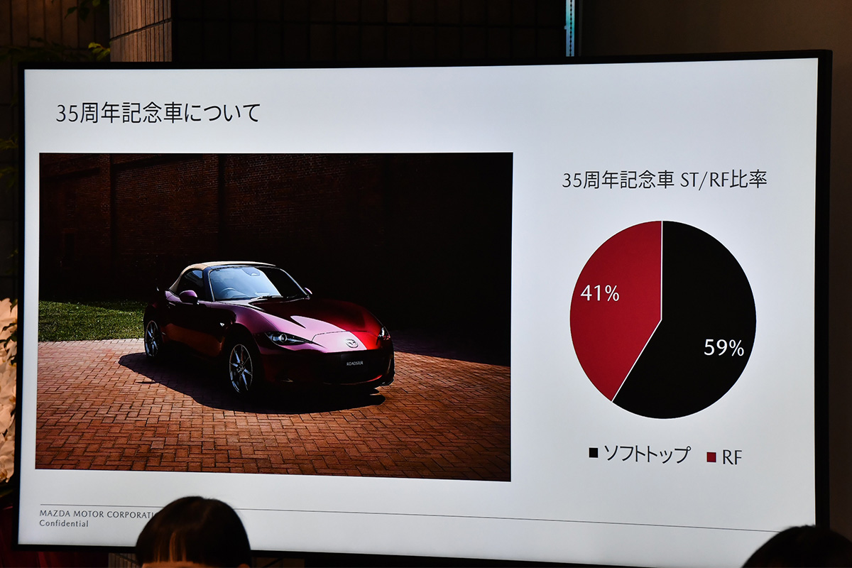 トークショーの最後は、現状のロードスターのボディカラーごとの販売構成比率や、35周年記念車の販売状況についての最新状況がマツダ側から説明されました。35周年記念車は受注状況が好調で、通常モデルと比較するとよりヴィンテージを意識した仕様ということで、RF(電動ハードトップモデル)の人気が高くなっているとのことです。