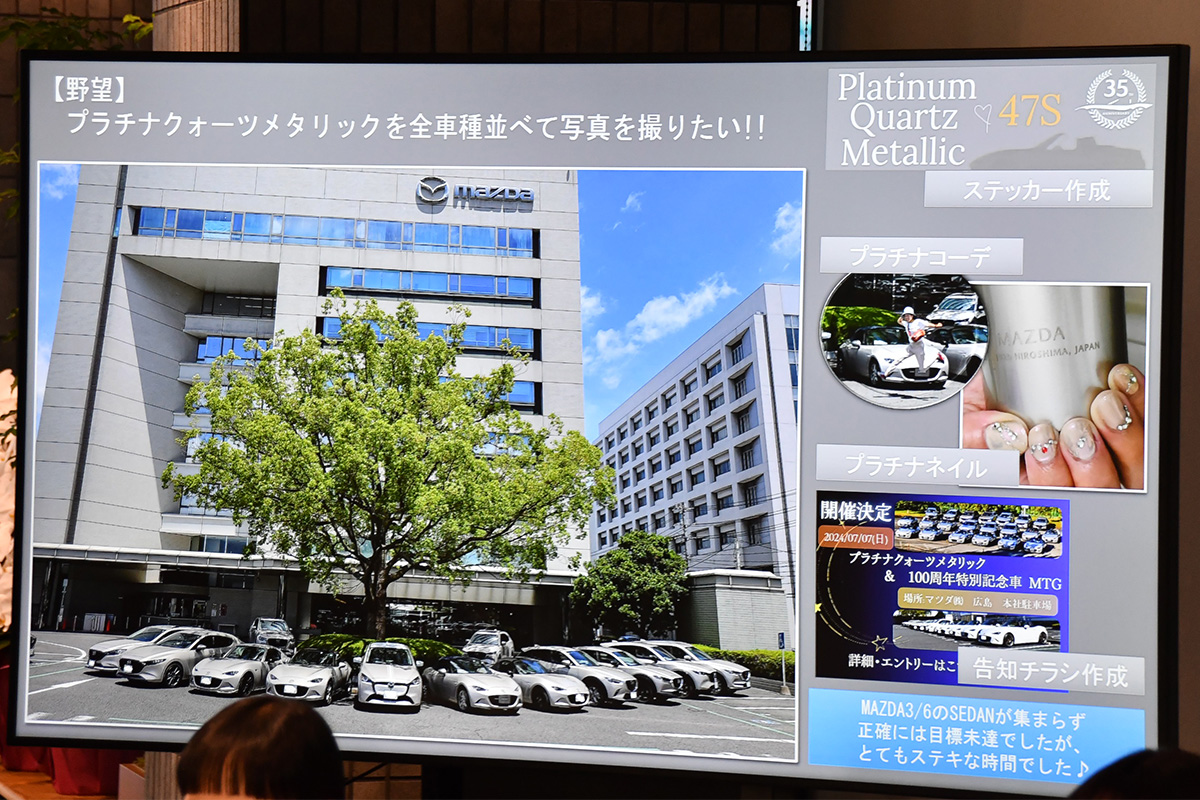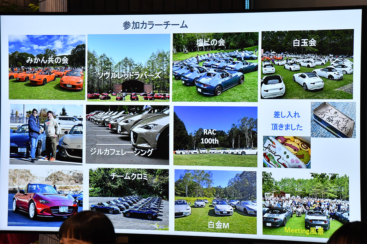 また3人はそれぞれのボディカラーをテーマとしたミーティングを主催したり、そのメンバーに所属したりしており、多くのミーティングやオフ会が実施されているロードスターのなかでも、ボディカラー区切りで多くのチームが存在していることも説明されました。