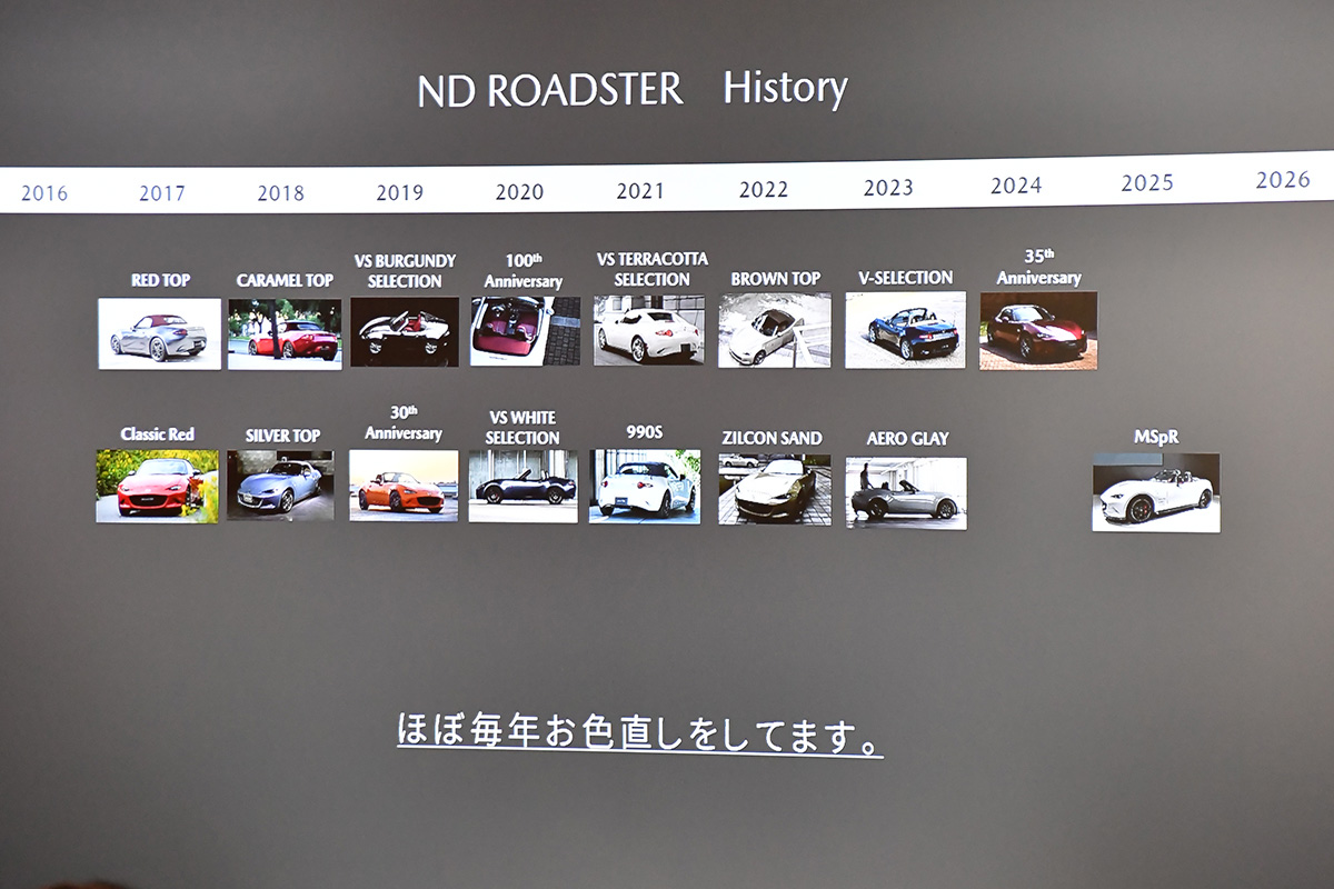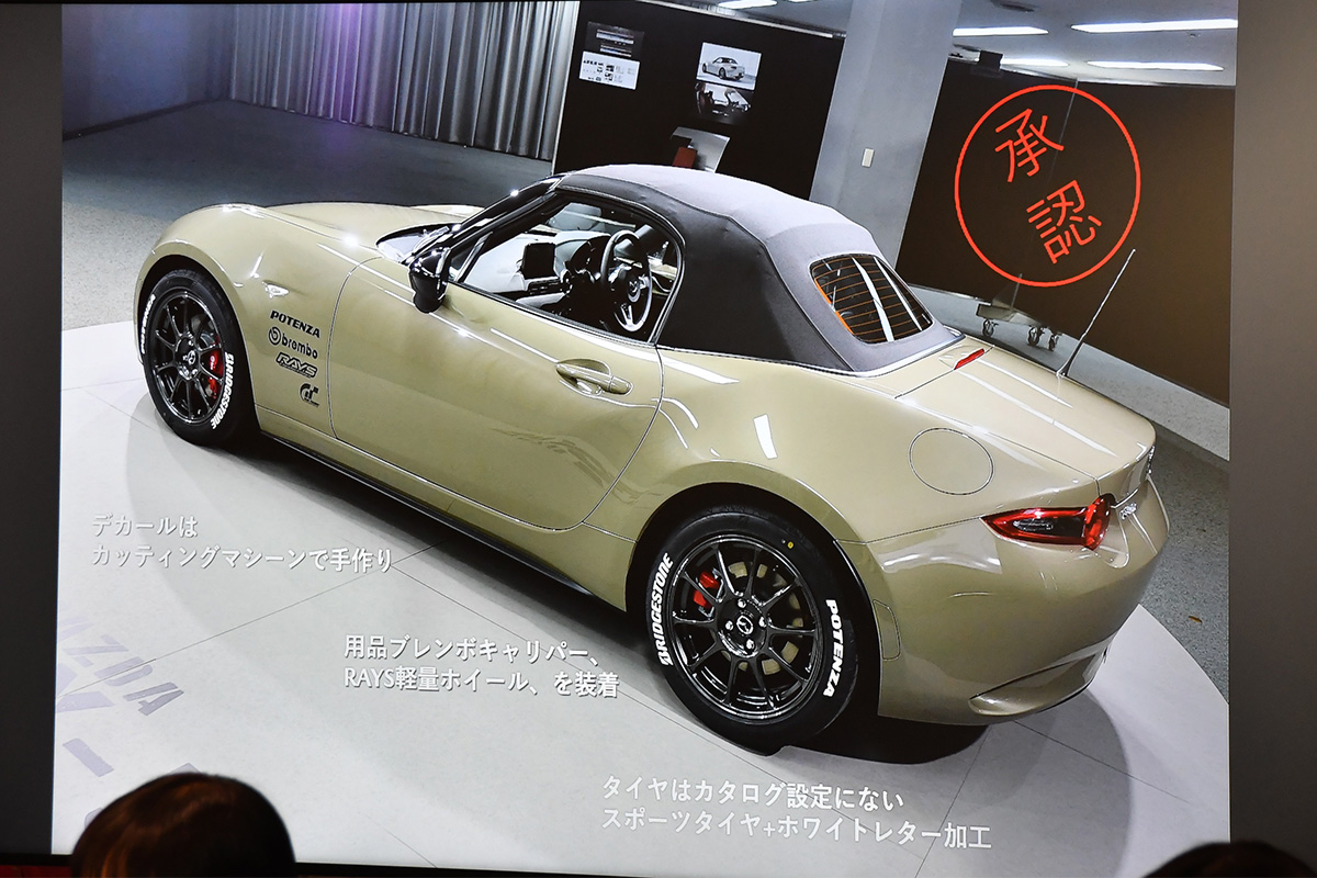 実際の外板色の承認イベントでは、車体の右側はフルノーマル状態、左側は「ジルコンサンドはこのように楽しんでほしい」という理想バージョンとして、手作りデカールやホワイトレター入りのタイヤ加工などをおこなって承認を得られたというエピソードも紹介されました(ジルコンサンドメタリックは、2024年末の改良タイミングで残念ながらロードスターへの設定は廃止)。