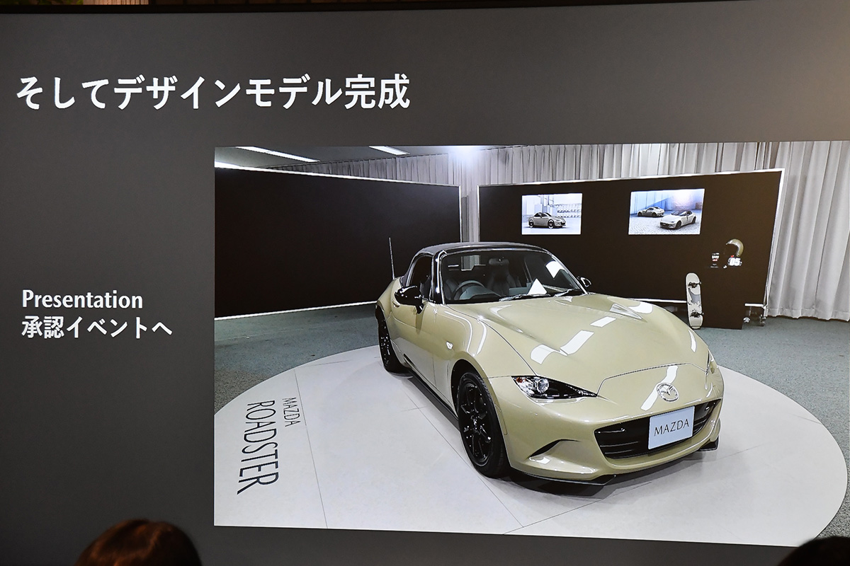 当初カラーの開発時にはロードスターへの採用予定はなかったそうですが、社内で「これをロードスターにも塗ったら結構似合うのでは…?」という声があり、デザインモデルを製作して(製品化するための社内審査である)承認イベントへ進むことになったそうです。