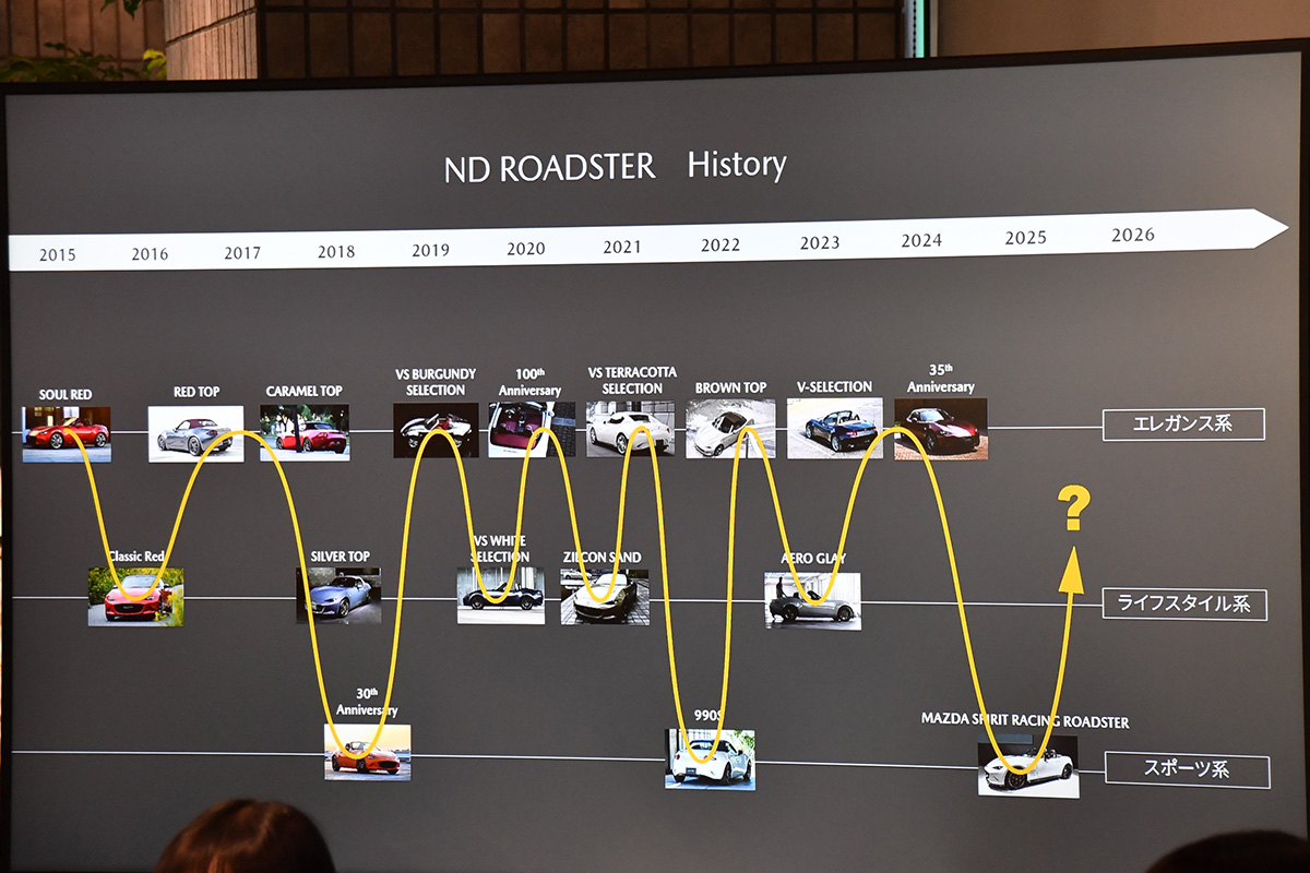 現行型NDロードスターが登場した2015年以降、設定ボディカラーの変更や特別仕様車の追加など、ほぼ毎年「お色直し」が実施されていることが説明されました。加えて岩内さんは、それらを「エレガンス系」「ライフスタイル系」「スポーツ系」の3種類に分類でき、それぞれが規則的なループを伴って展開されるという「法則性」があると説明しました。