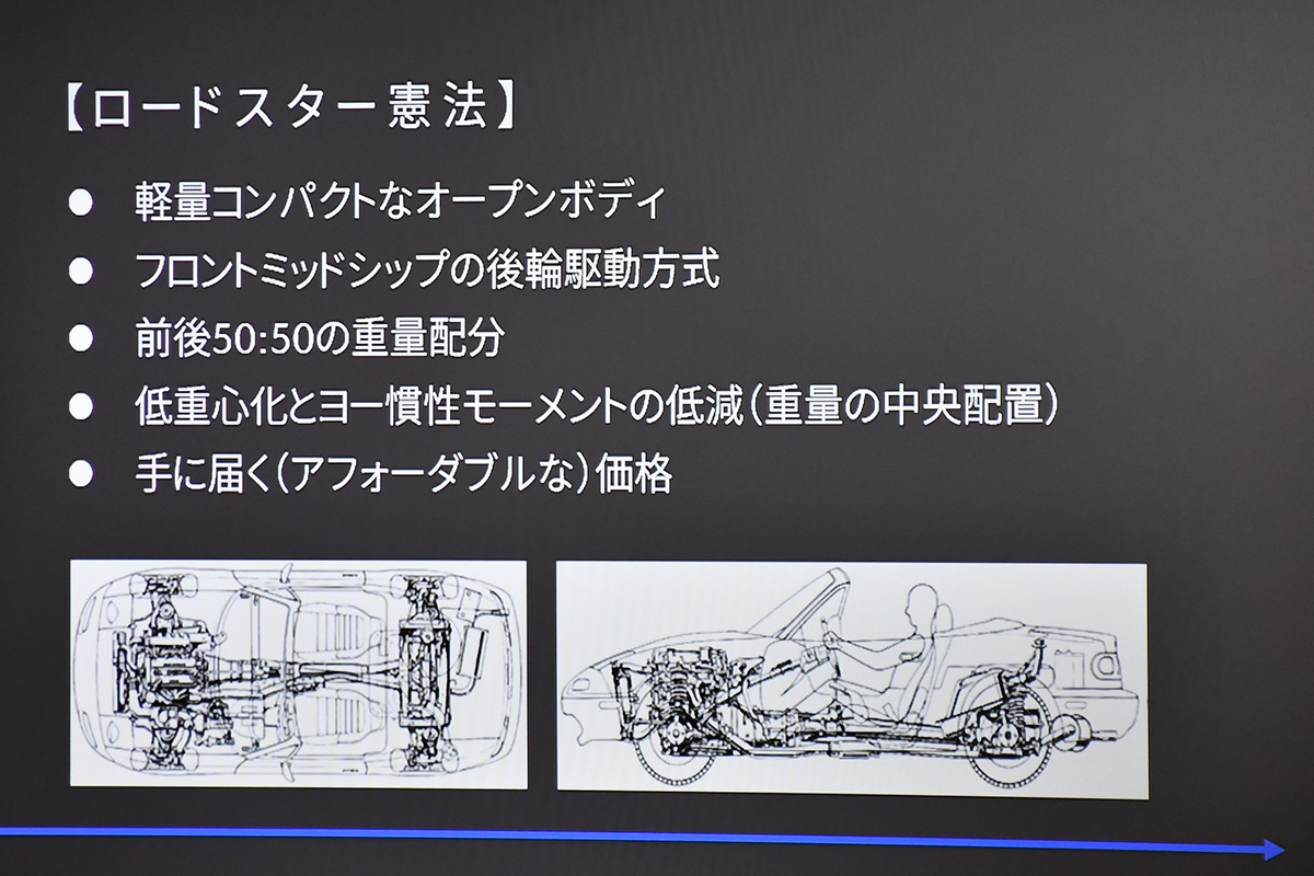 イベントは、NDロードスター主査の齋藤さんによるプレゼンテーションからスタート。ライトウエイトスポーツカーの世界的な繁栄と衰退の歴史から、初代ユーノスロードスター(NA)誕生までの背景について解説しました。