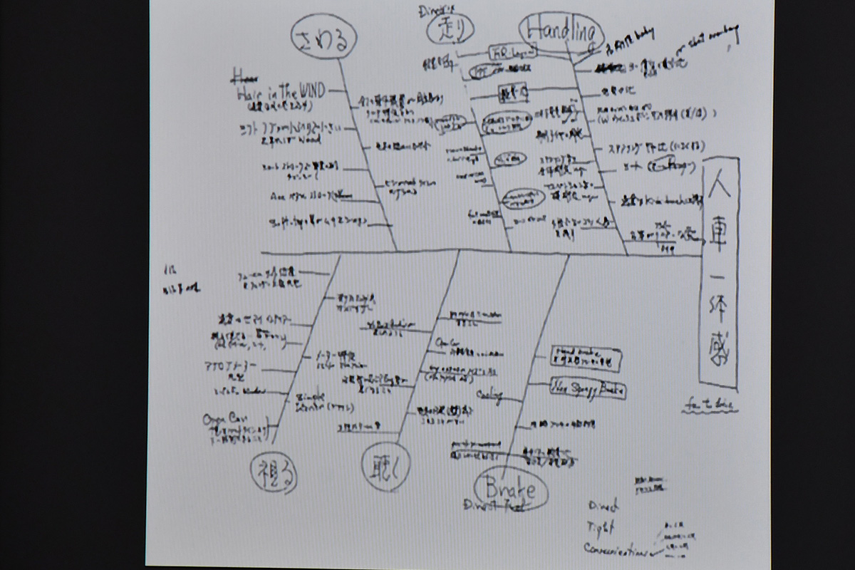また、市販最終デザインの「凍結」に至るまでのブラッシュアップの過程や、開発当時のこだわりが時間とともに「ロードスター憲法」5カ条として社内で共有されるようになった経緯なども紹介されました。さらに、初代NA型の開発メンバーであり、2代目NB型や3代目NC型の開発主査を務めた貴島さんによる「人馬一体」コンセプトにつながる要素項目の直筆メモなど、ロードスターの歴史が始まるまでの背景や、その後35年間にわたる歩みが貴重な資料とともに発表され、抽選で選ばれた会場内の参加者の注目を集めていました。