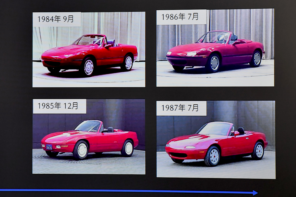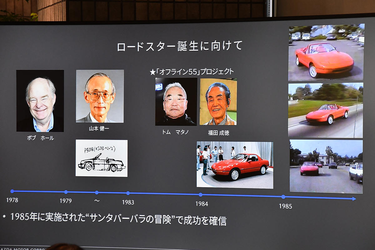 1980年当時の時代背景から「オフライン55」と呼ばれるマツダ社内のプロジェクトなど本格的に開発着手にいたるまでの経緯、また開発拠点の通称「リバーサイドホテル」での出来事など、マツダ社内外のさまざまな人物とのエピソードも含めて話が展開されました。