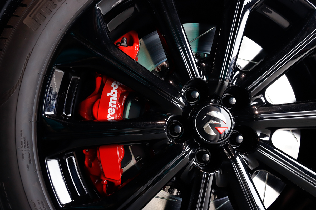 足回りについては正式にはアナウンスされていませんが、レッドの塗色の車高調整式サスペンションが装着されていて、通常のCX-60に比べると明らかに低くスポーティなスタンスを実現しており、タイヤにはピレリの「P ZERO」が装着されています。