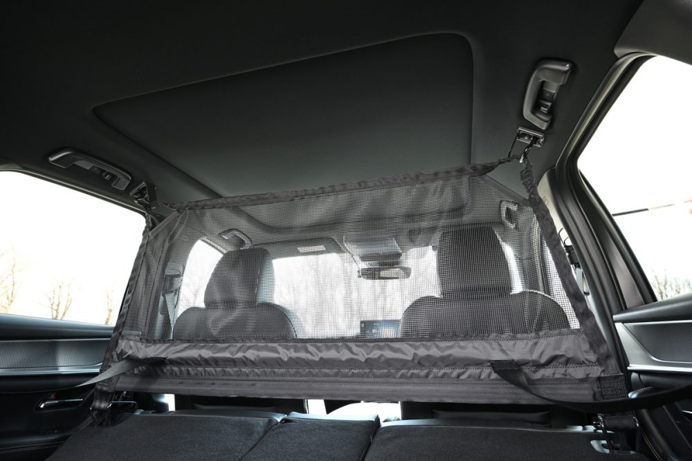 パーティションネットとは、急ブレーキ時などに積み荷が荷崩れを起こしたり、前方へ飛び込んだりしないように、荷室と居住空間を区切るネットのこと。必要に応じて着脱可能で、後席もしくは前席の直後にも装着できるようになっています。単にネットが追加されているだけでなく、天井の左右に、通常の日本仕様車にはないフックが組み込まれているのです。