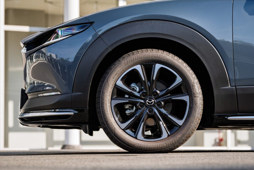 このホイールがアンダーガーニッシュと相まって、足元をより精悍でスポーティな印象へと昇華させ、CX-30が持つプレミアムな雰囲気を一層際立たせます。