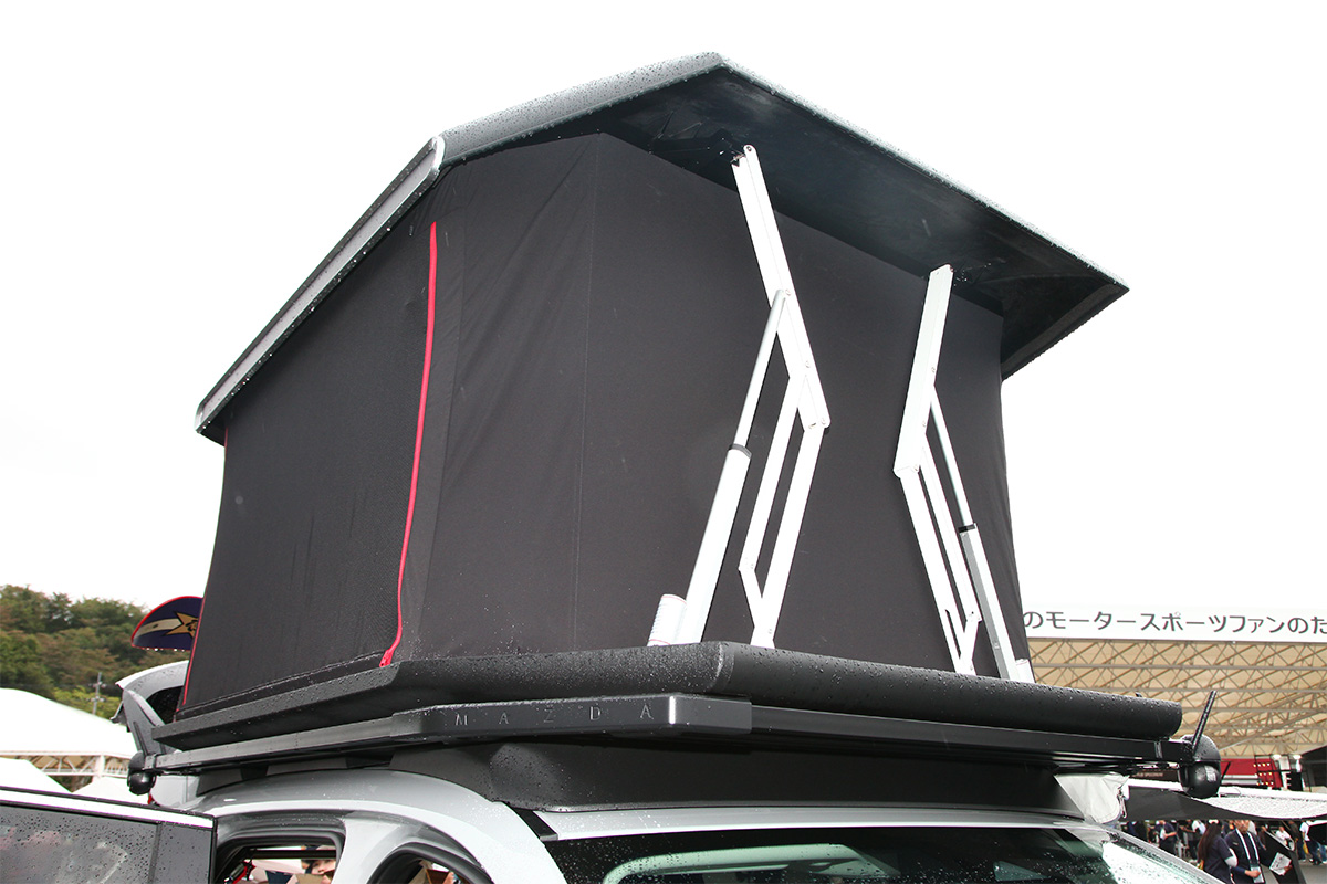 今回はマツダ社内でアウトドアを楽しむ社員を中心にアイデアを募ったということで、CX-80には立派なルーフトップテントを搭載していました。このテントは市販品ではなく展示のために作られたもので、テントの土台部分には「MAZDA」の文字も入れられた凝ったものです。