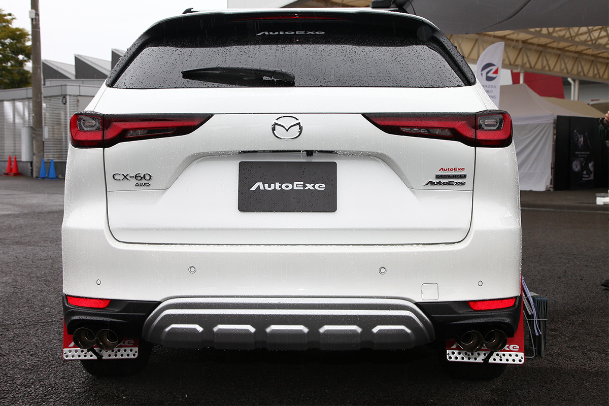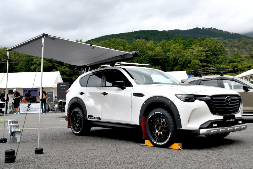 会場で披露されたCX-60には、すでに同社からリリースされている既存のパーツに加え、オフロードテイストのデザインのフロントアンダーガーニッシュ、フロントグリル、リアアンダーガーニッシュ、オーバーフェンダーセット、マッドフラップセット、デカール類などを装着しています(サイドオーニングはスーリー社のもの)。