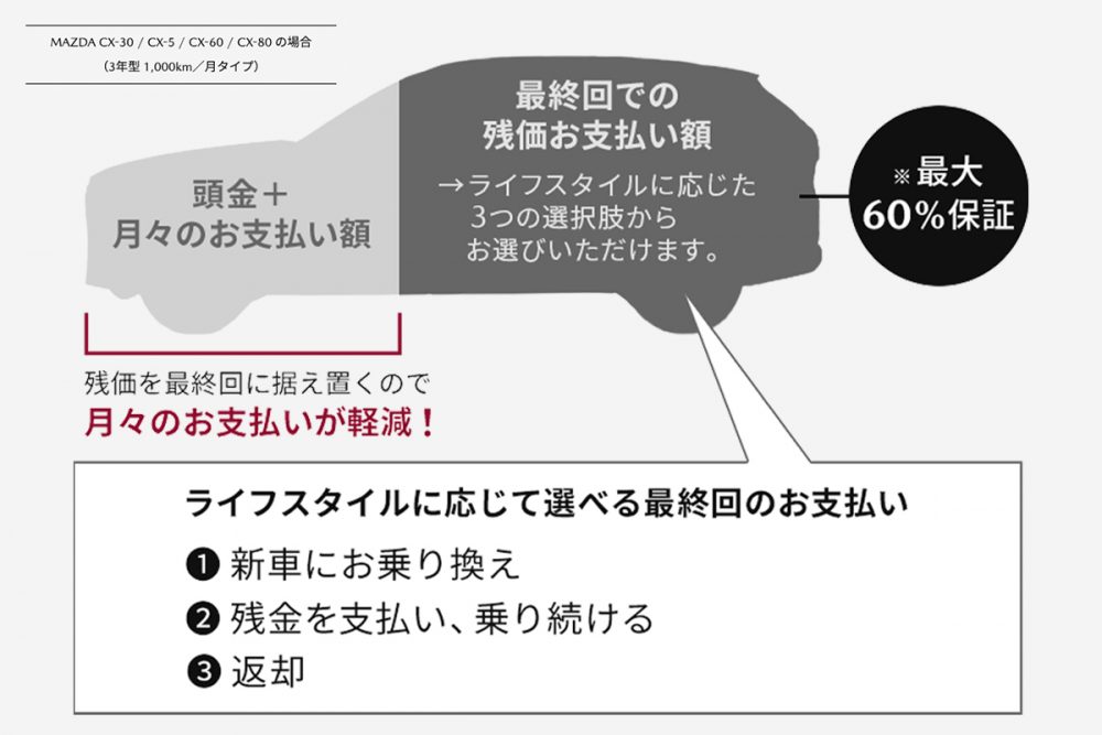 残価が高く設定されるSUV市場では、特にCX-5のような人気車種はリセールバリューも期待できるため、残価設定ローンとの相性が良い傾向にあります。もちろん、返却・精算せずに、そのまま買い取って乗り続けることもできます。