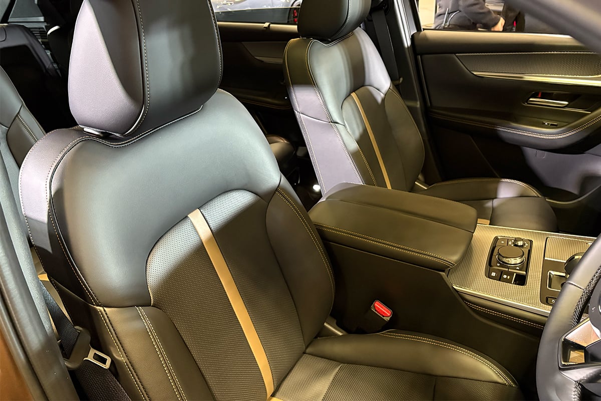 XDドライブエディション ナッパレザーパッケージになると、文字通りシート生地が標準のレザーから、ナッパレザーに上級化されます。6人乗りでは、セパレートタイプの後席の中央にセンターコンソールボックスが装着され、上級ミニバンの2列目シートのような機能と雰囲気も得られます。助手席の電動調節機能が充実して、Boseサウンドシステム+12スピーカーも標準装着されます。