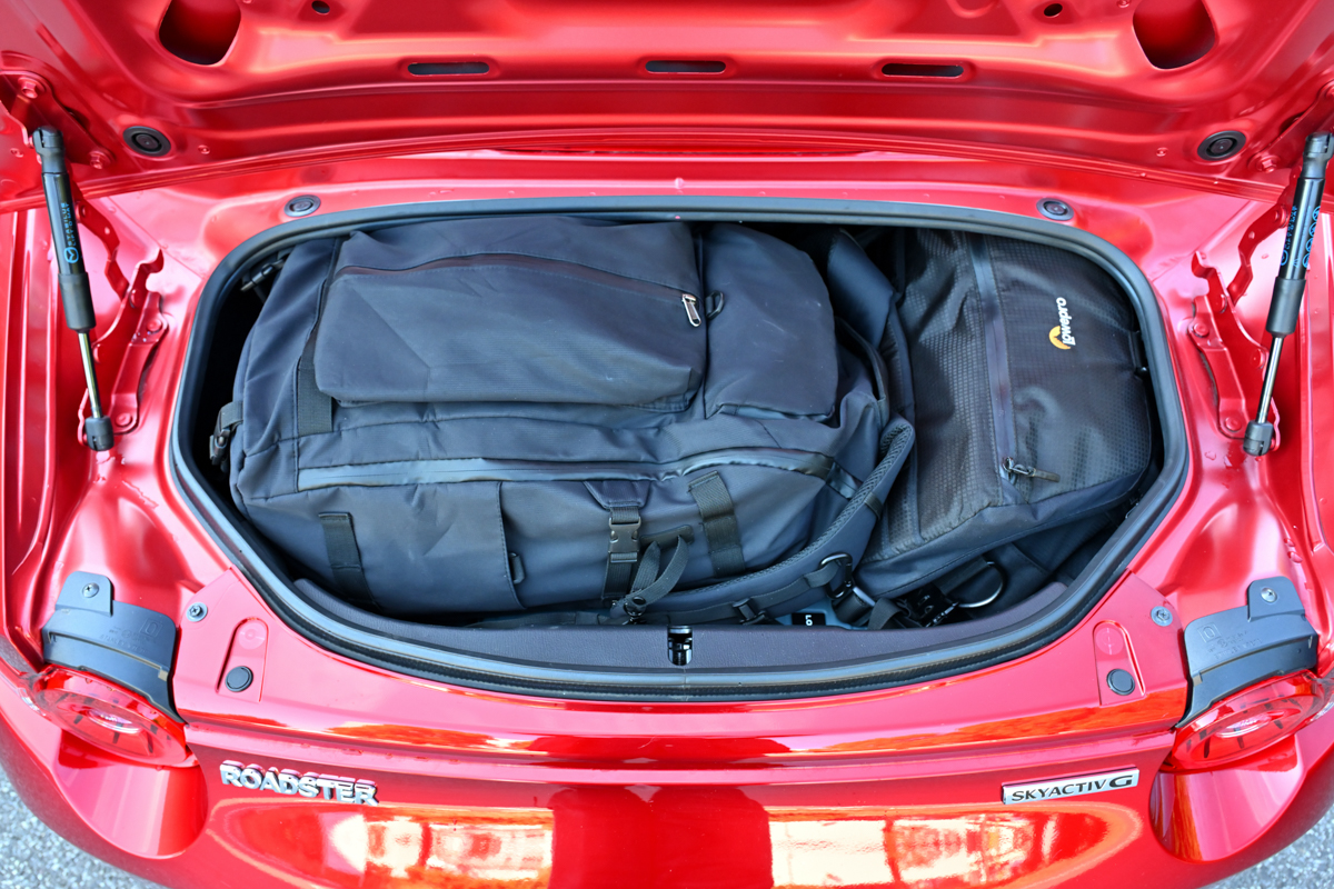 今回、編集者と2人で3泊4日の出張に行き、機材を多少減らしながらもスーツケースと2人分のバックパック、手荷物、お土産などを満載していきましたが、車内空間を圧迫することなく、トランクとソフトトップ収納部分に積み込むことができました。