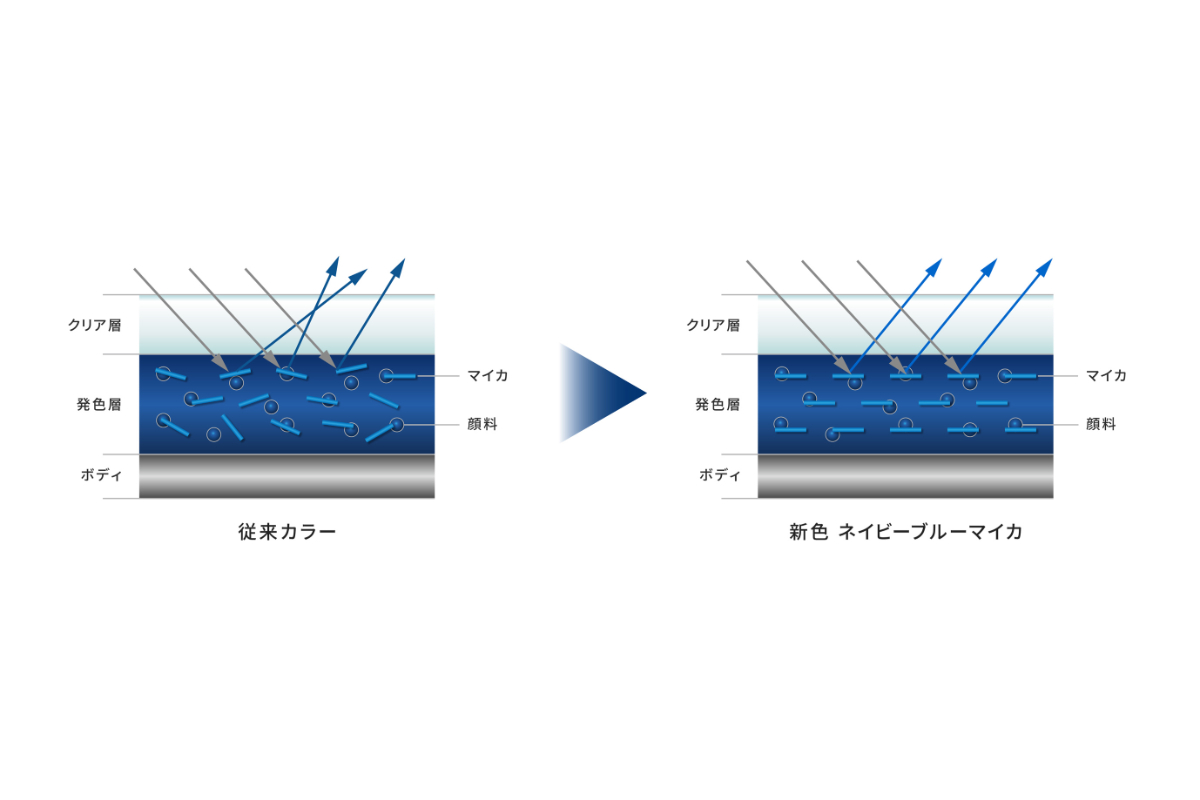 また、これまでの知見や技術を活かし、緻密でクリアな色味や質感と明暗差を際立たせる高コントラストを両立するために、複数種類のマイカをバランス良く配合した上で、水平に配置。これによって地域や天候に左右されず、様々な環境でクルマの造形を際立たせるカラーを実現しています。
