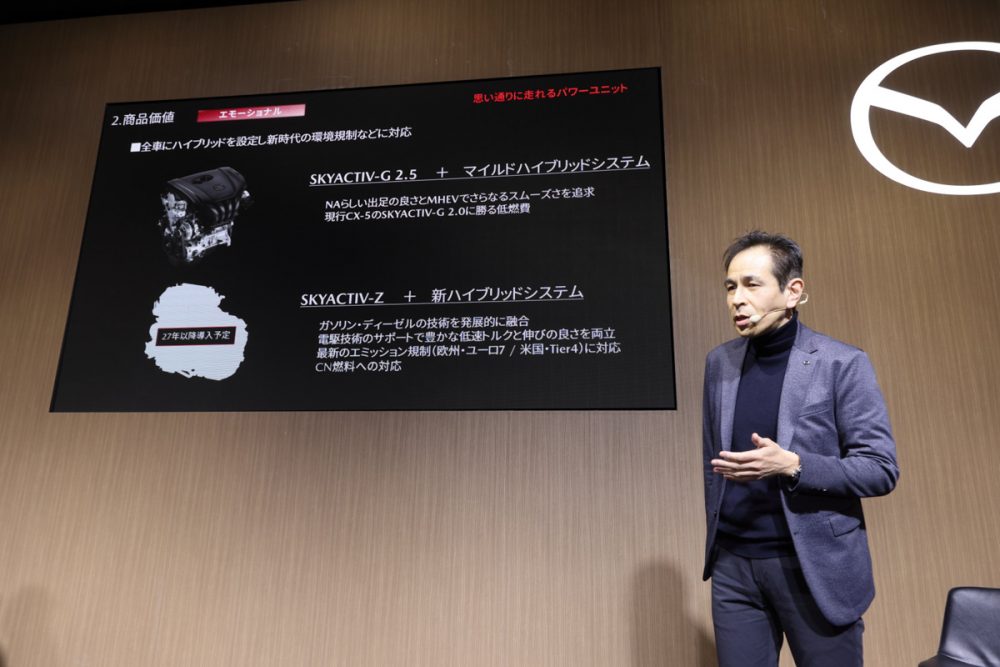 また将来的には、2027年以降に「スカイアクティブZ+独自のストロングハイブリッドシステム」を組み合わせたパワートレインを導入予定と説明されました。