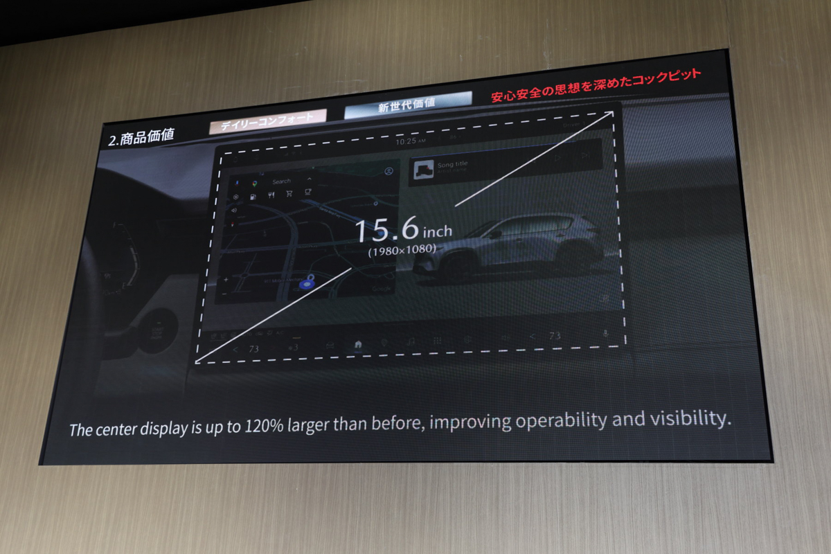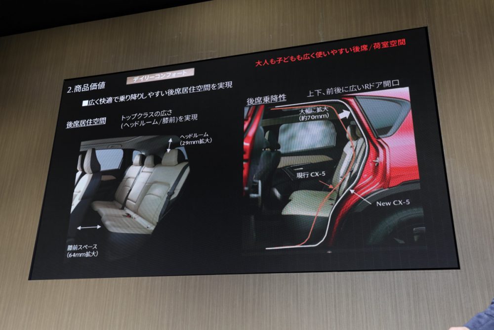 新型CX-5は、全車ハイブリッド化という大きな変化に加えて、後席・荷室の拡大、乗降性改善、Google搭載によるHMI刷新など、日常の快適性を底上げする進化が詰め込まれたモデルとして紹介されました。