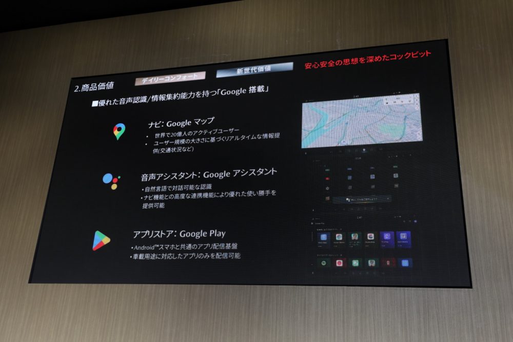 ナビにはGoogleマップ、音声アシスタントにはGoogleアシスタント、アプリにはGoogle Playを採用し、スマホ接続なしでも利用可能な設計だと言います。例えば、近隣で口コミが良い店を音声検索し、そのままナビ誘導するといった使い方も想定されています。