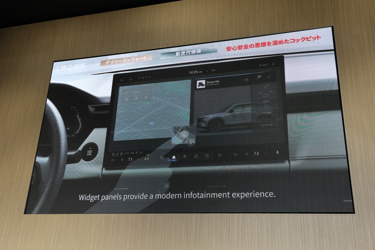 安全思想の柱として語られたのは、優れた視界・視認性、理想的なドライビングポジション、運転集中を支えるコックピット設計です。今回の刷新重点は、このコックピット設計にあると説明されました。新型CX-5は、必要なスイッチは物理で残しつつ、直感的なタッチスイッチと高い音声認識を採り入れています。