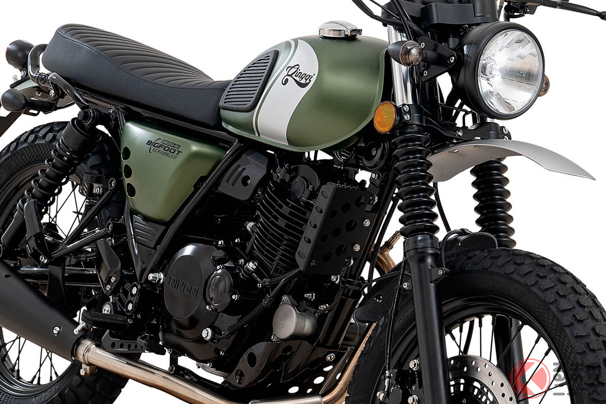 価格52万円! クインキー「“新型”軽二輪スクランブラー」国内導入! クラシカル外装&シンプル単気筒エンジンで気負わずに楽しめる「BIGFOOT250 Scrambler」登場