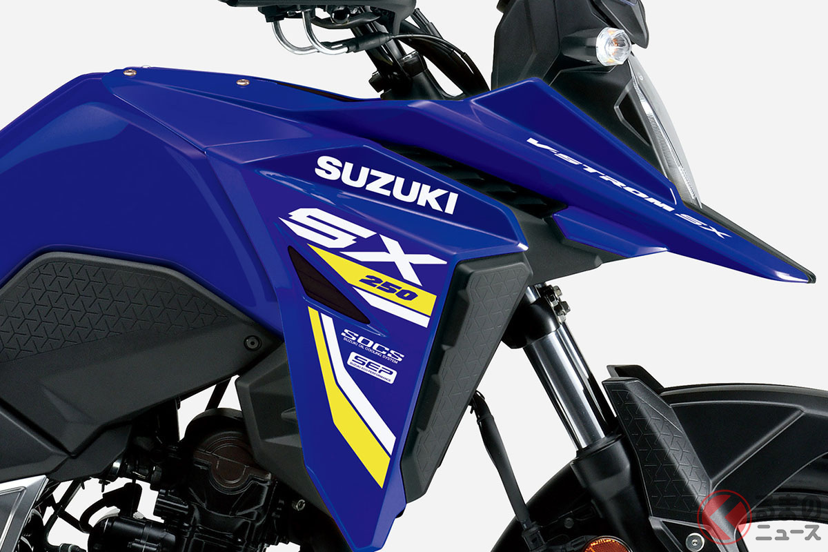 価格60万円! スズキ「“新”小排気量アドベンチャー」発売! 唯一無二の“油冷”エンジン&軽量な車体で快適性と優れた走破性を両立! “口ばし”デザイン採用の「V-STROM 250SX」26年モデル登場