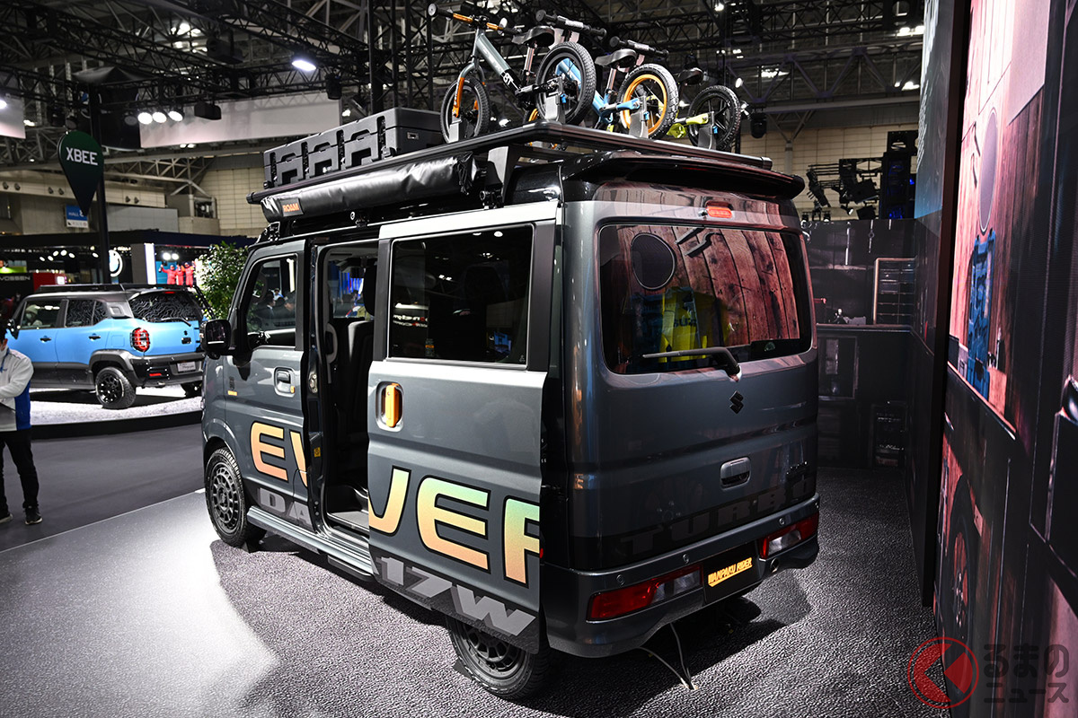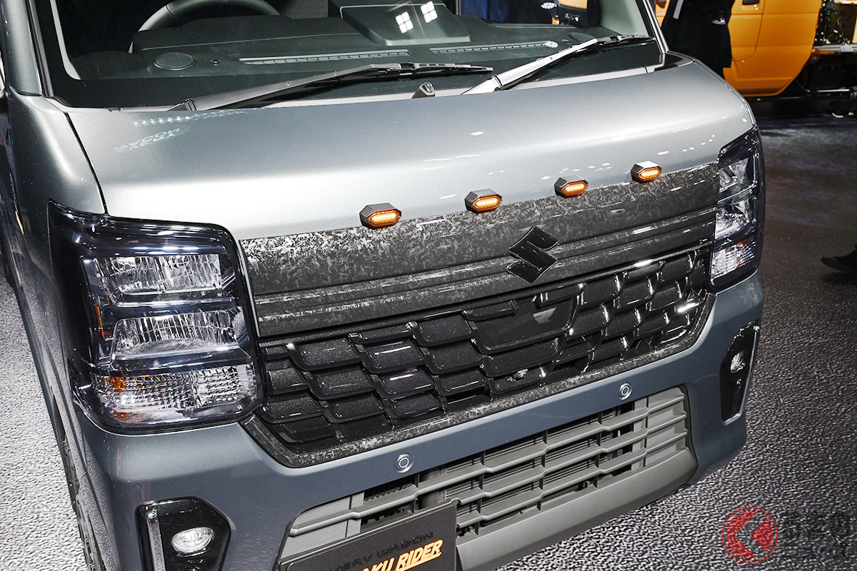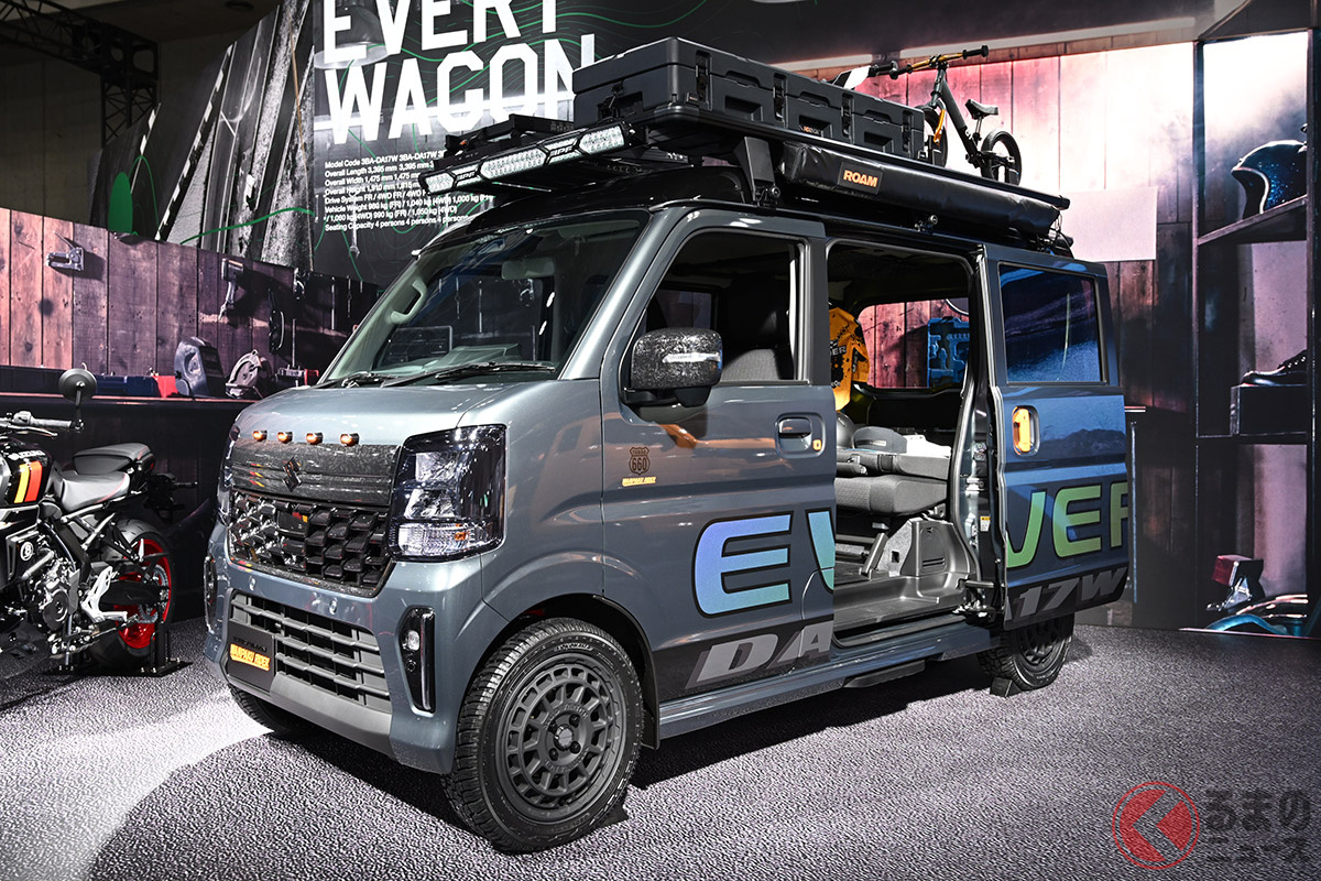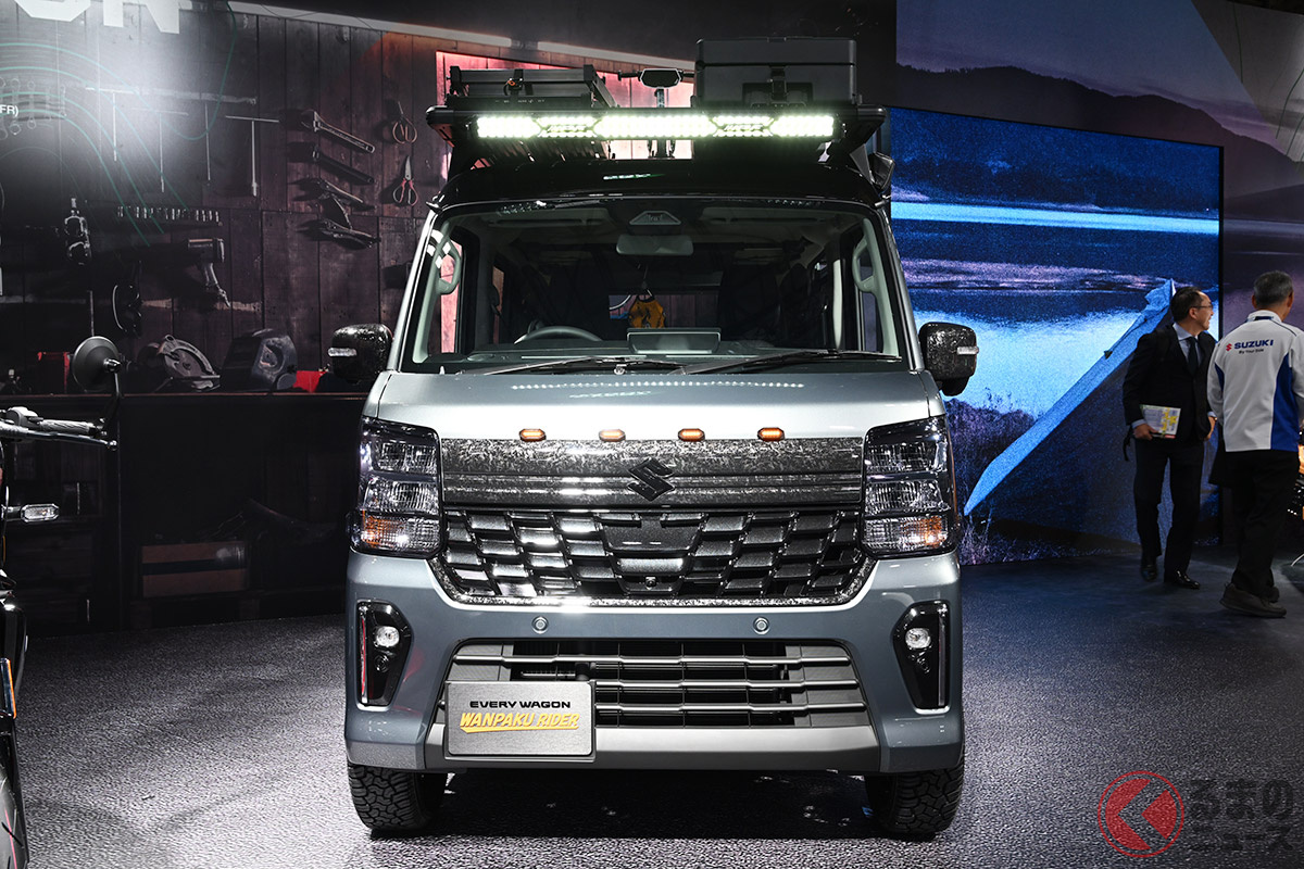 スズキ「“凄い”エブリイワゴン」初公開! 斬新“黒い大型グリル”&オフロードタイヤ装着でタフ感マシマシ! 市販化熱望の“軽商用車カスタム”「ワンパクライダー」とは!