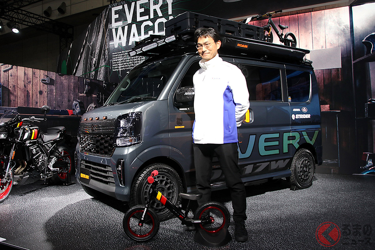 スズキは「エブリイワゴン」のカスタムコンセプトとして「ワンパクライダー」を「東京オートサロン2026」で初公開しました。大胆なカスタムが施されたこのモデルについて、デザイナーに話を聞いてみました。