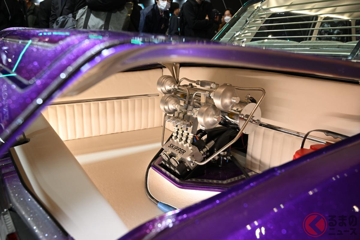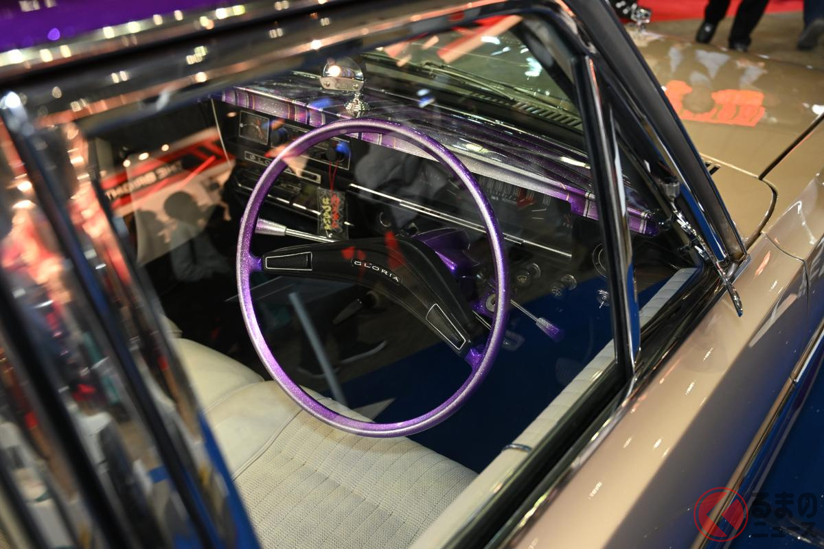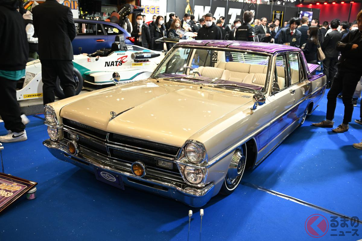 斬新「“縦目”FRセダン」初公開! 全長5m級“ながーーい”レトロボディ×めちゃ綺麗な「豪華内装」の紳士仕様! ド迫力マフラー&ベタベタ車高もカッコイイ! 日産グロリアベースのNATS「和製ローライダー」登場!