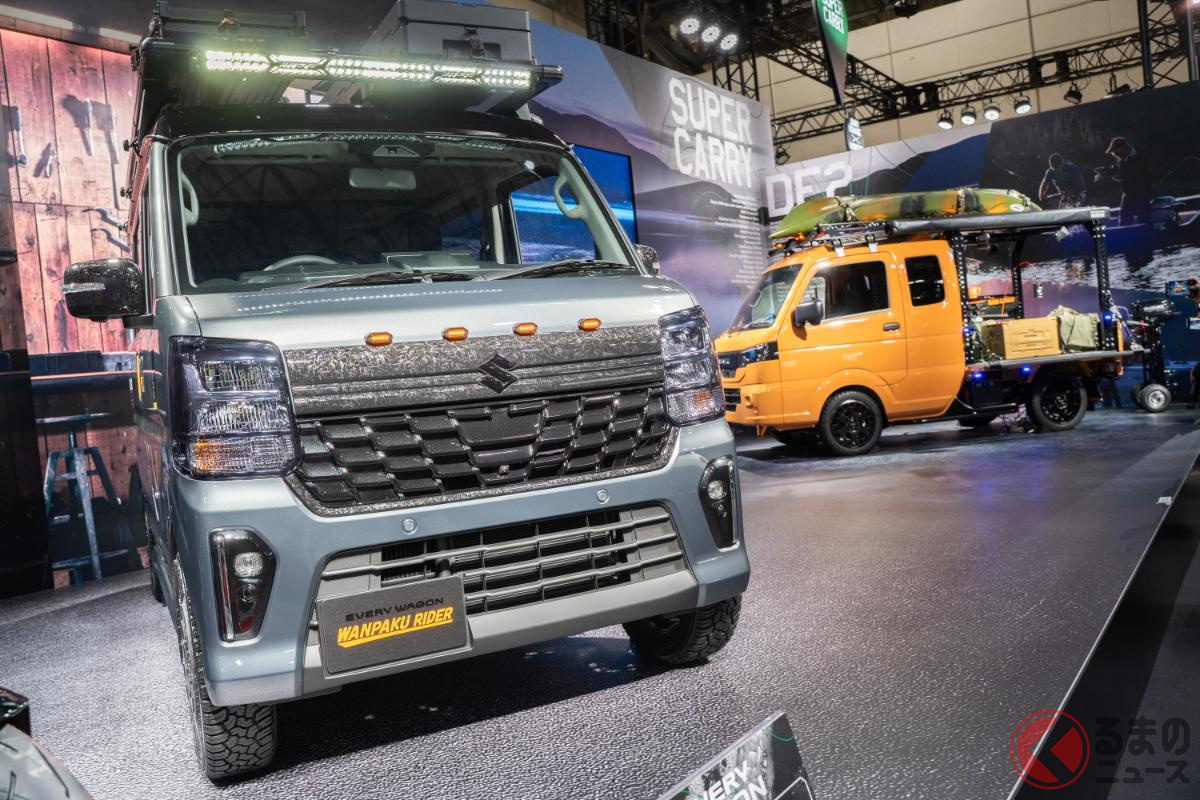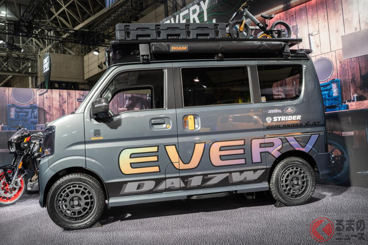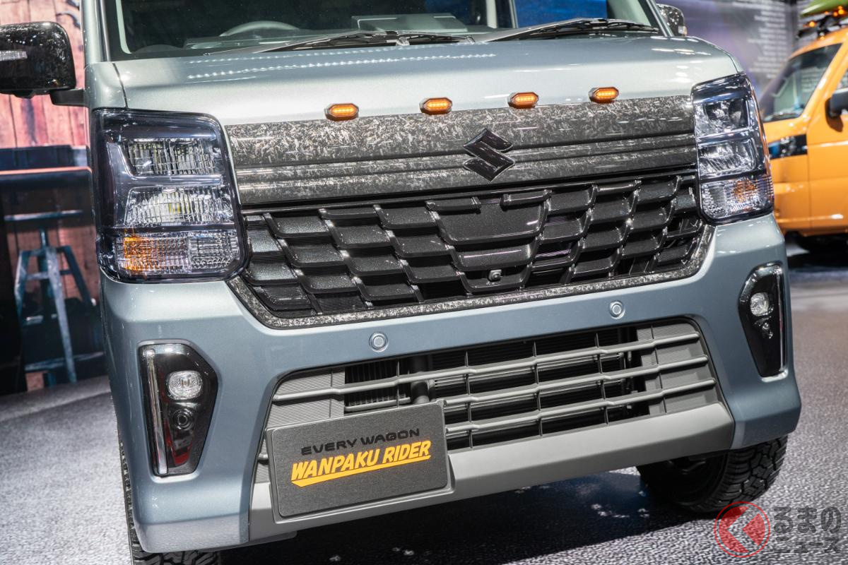 スズキ“新型”「エブリイ」!? “10年ぶり顔面刷新”の「新モデル」まもなく登場!? 迫力顔の新「EVERY WAGON WANPAKU RIDER」初公開…どんなモデル?