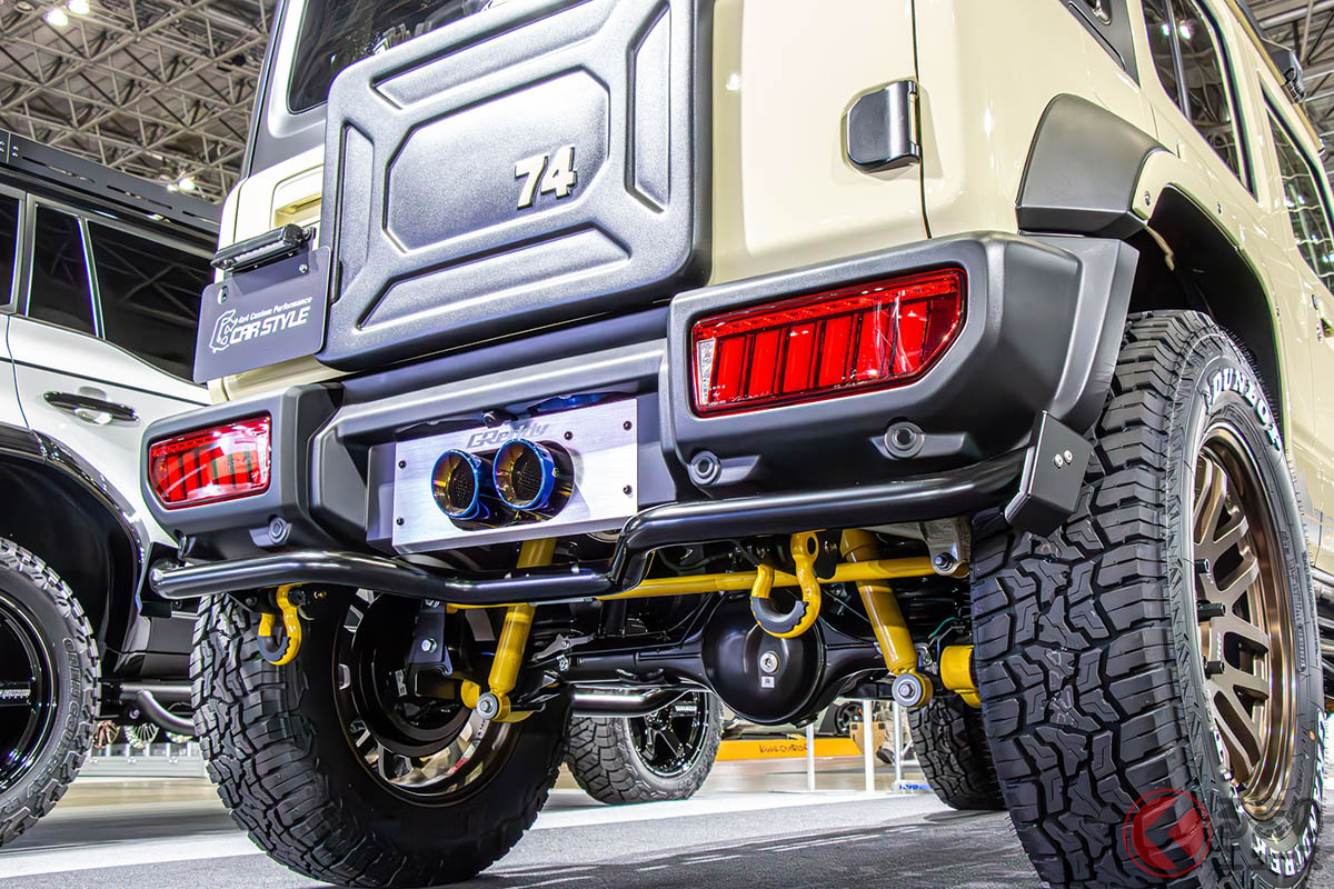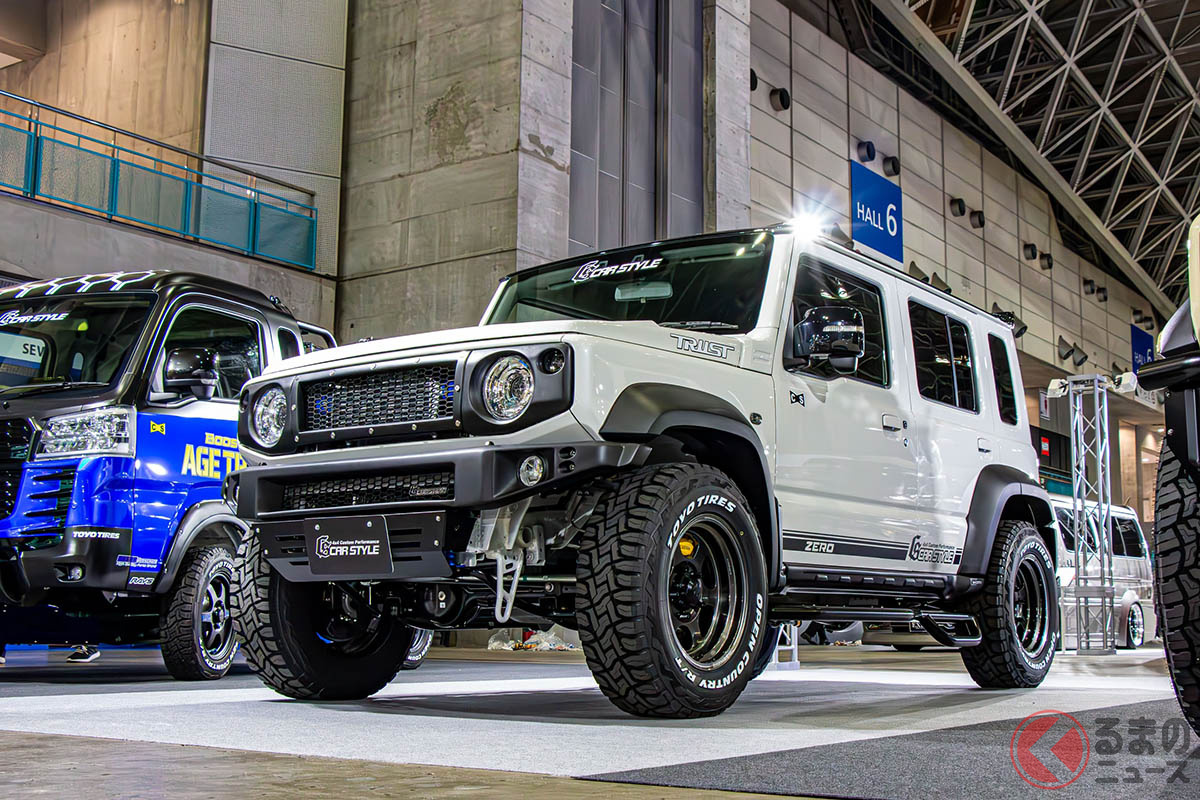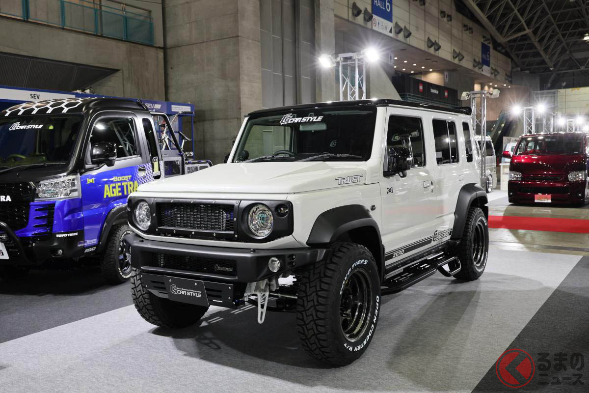 スズキ「斬新“レーシー”ジムニー5ドア」が凄い! 「車高アゲず」に「ピアスボルトグリル」×「精悍バンパー」が超カッコイイ! 新時代の「画期的カスタム」CARSTYLEがTASで披露
