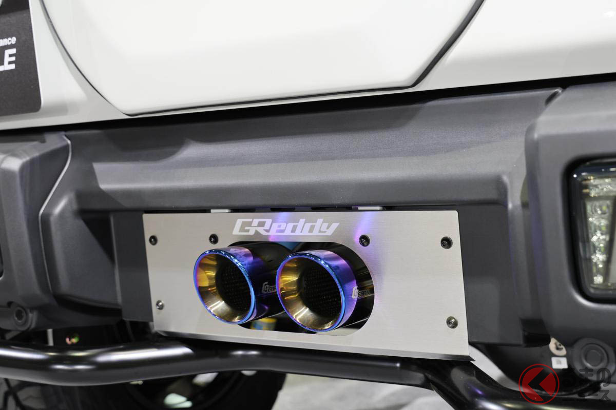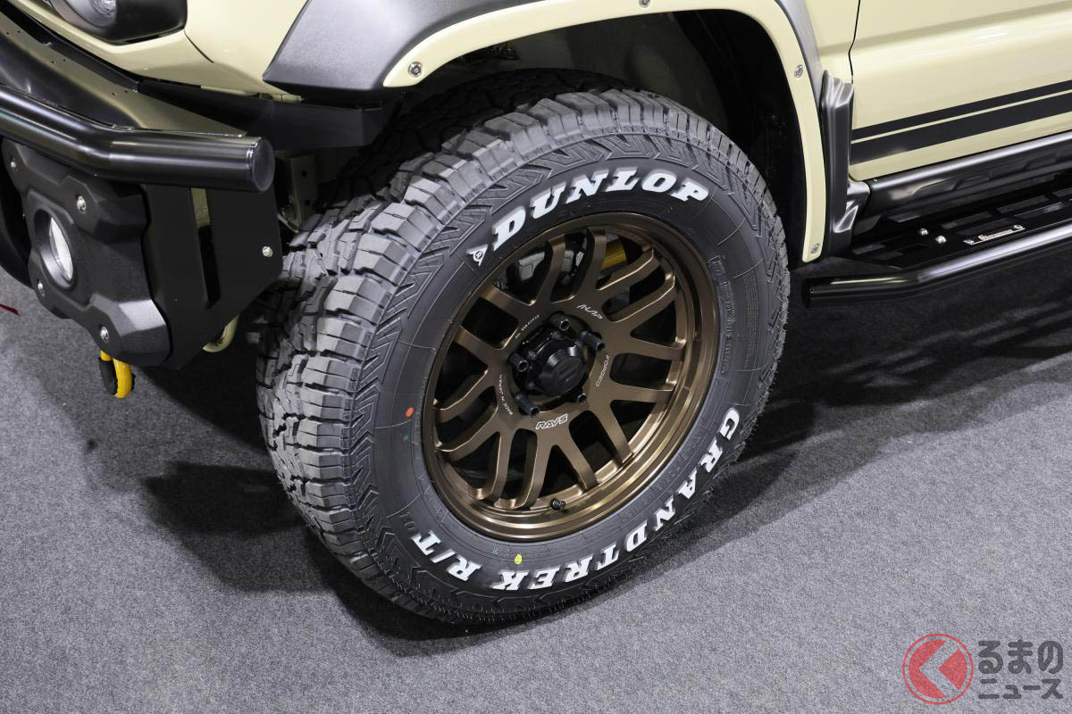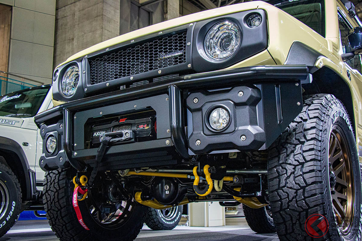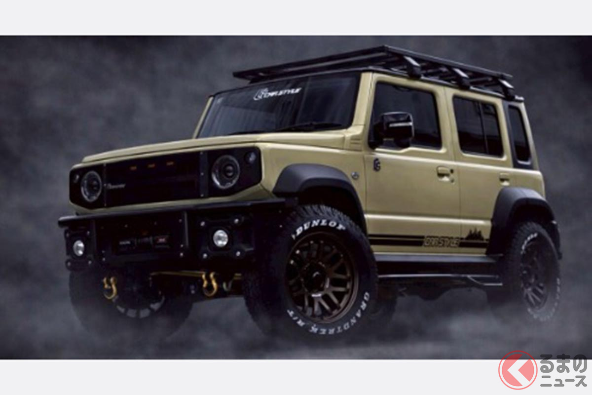 スズキ「斬新“レーシー”ジムニー5ドア」が凄い! 「車高アゲず」に「ピアスボルトグリル」×「精悍バンパー」が超カッコイイ! 新時代の「画期的カスタム」CARSTYLEがTASで披露