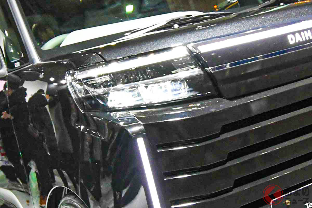 ダイハツ“新”「スライドドア“ワゴン”」公開! 攻めすぎな「“全部グリル”顔」&カクカクデザイン採用! “夜”の「タント カスタム クロメキ」どんなモデル?