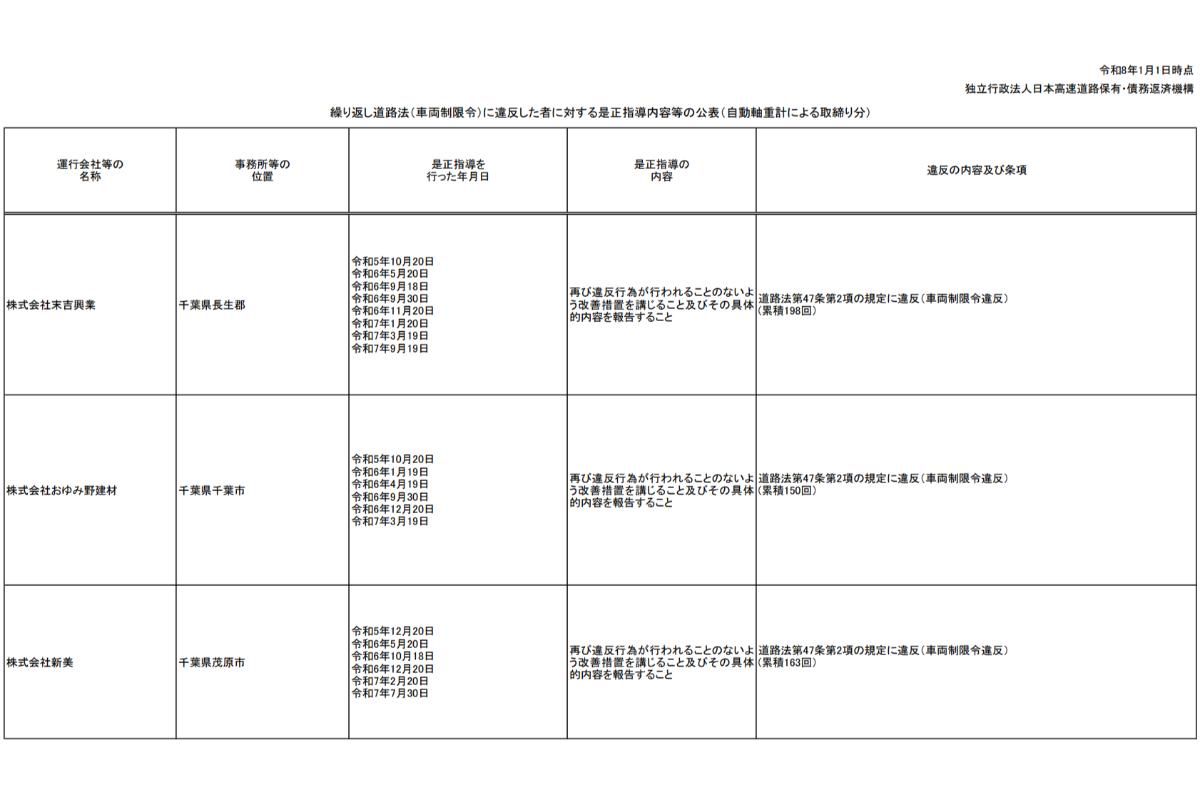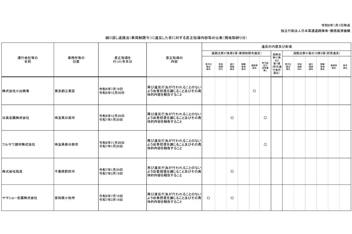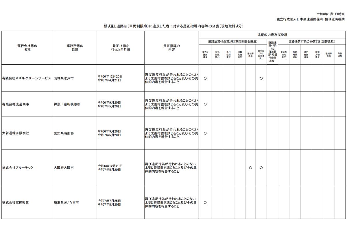 NEXCO西日本および日本高速道路保有・債務返済機構は、高速道路における車両制限令違反者に対する是正指導の内容を公表しました。