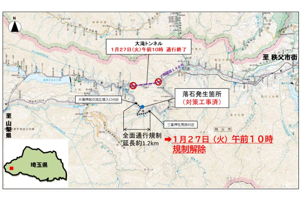 埼玉県は、国道140号のうち、秩父市内の一部区間で実施していた通行止めを解除するとともに、暫定供用していた「大滝トンネル」を通行止めにすると発表しました。