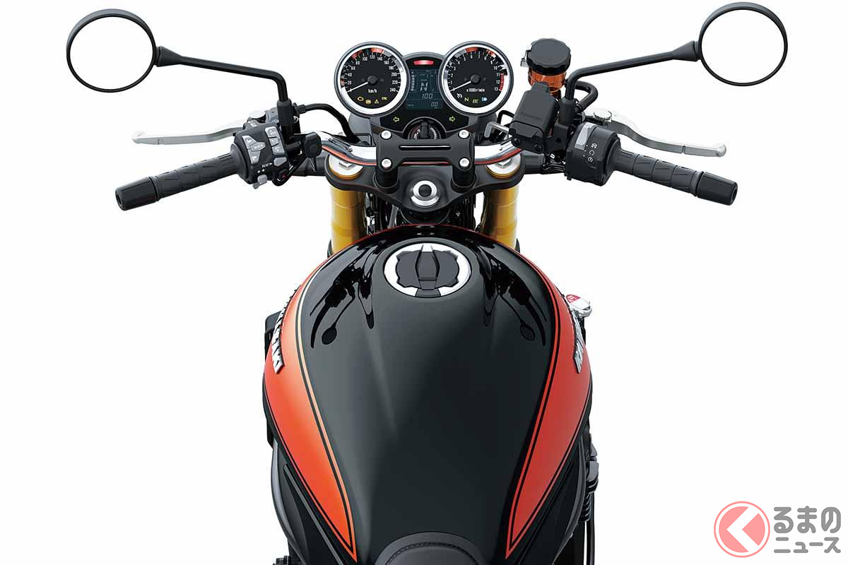 カワサキ 超レトロな「新・大型バイク」実車公開へ! 伝統的「ネイキッド」スタイルに往年の“Z1”彷彿させる「火の玉カラー」採用! めちゃ豪華な「ブレンボ&オーリンズ」も搭載した「新Z900RS SE」MCS2026登場!