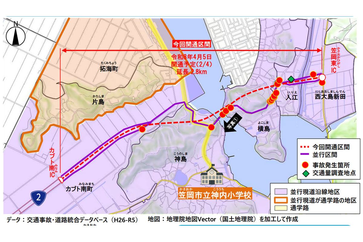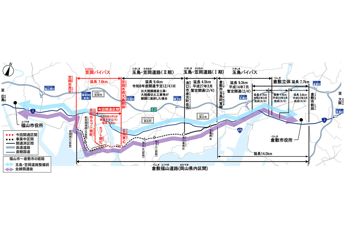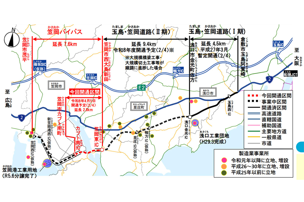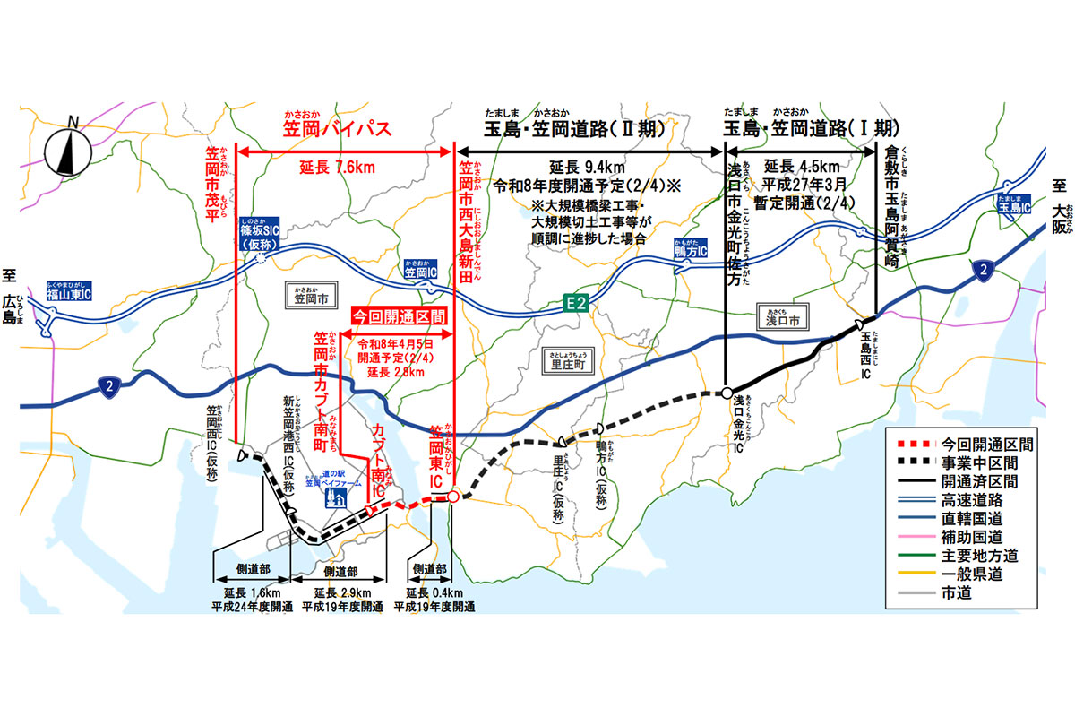 国道2号の「笠岡バイパス」(岡山県笠岡市)で整備が進められていた笠岡東IC~カブト南IC間の延長2.8kmが、2026年4月5日に開通します。