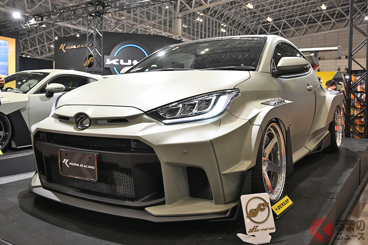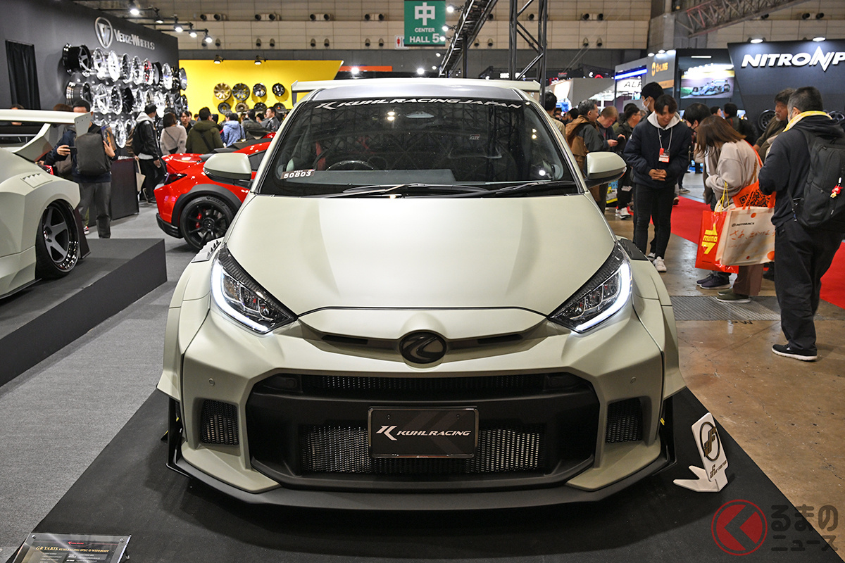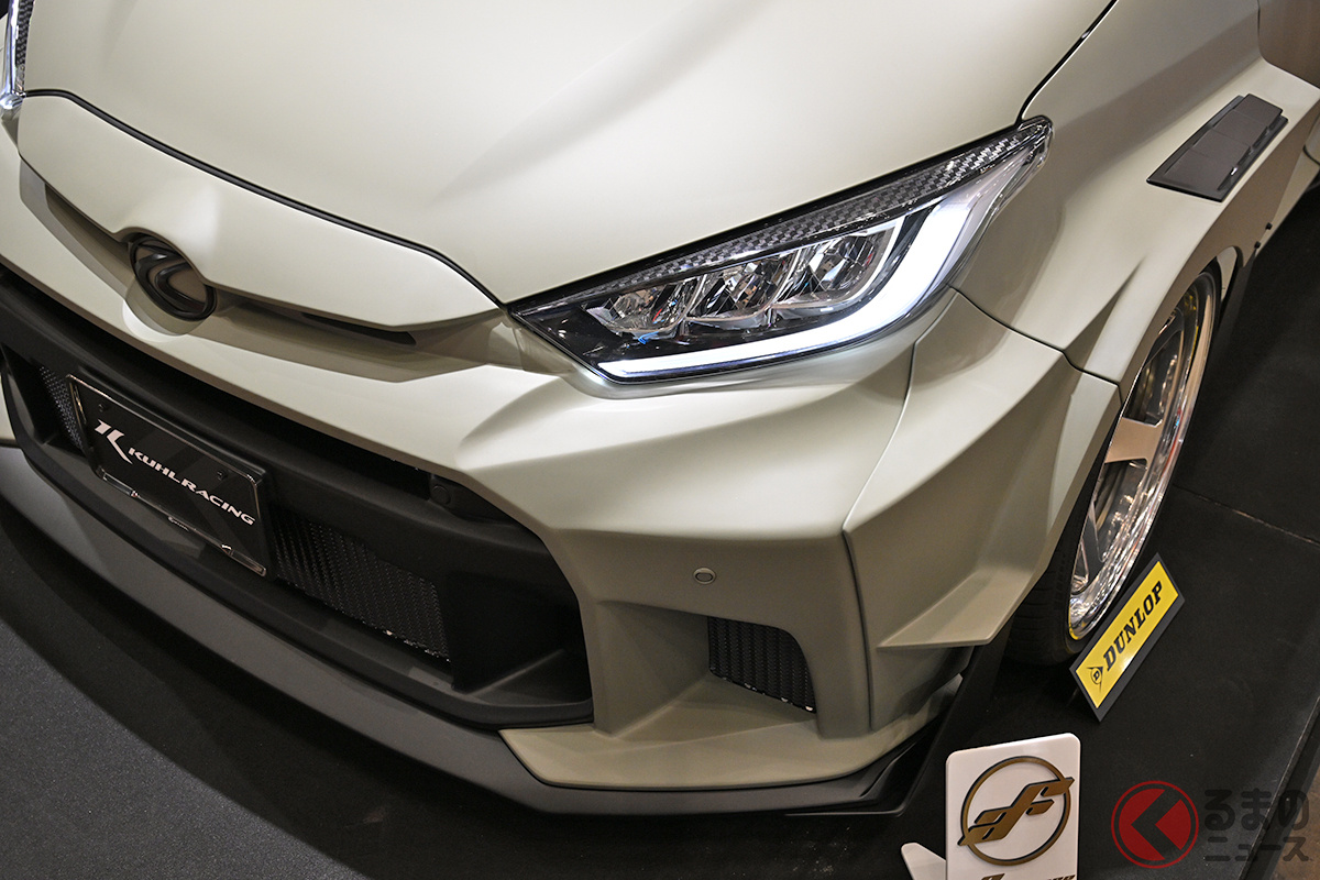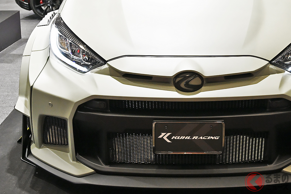 「スゴい“ウイング”…!」迫力あり過ぎ「GRヤリス」に目がテン! カクカクデザインの「超・拡大ボディ」がめちゃカッコいい! KUHLレーシング「SPEC-D ワイドボディ」カスタムに“熱視線”集まる