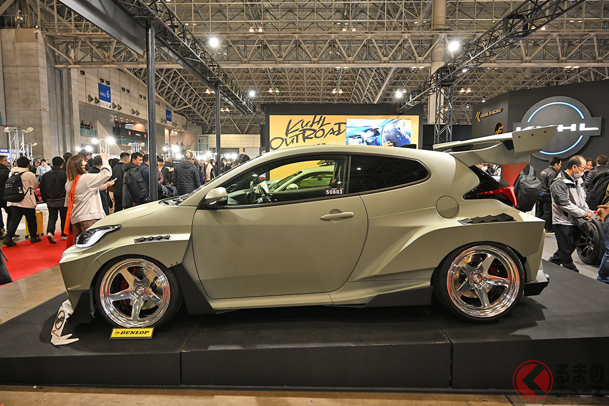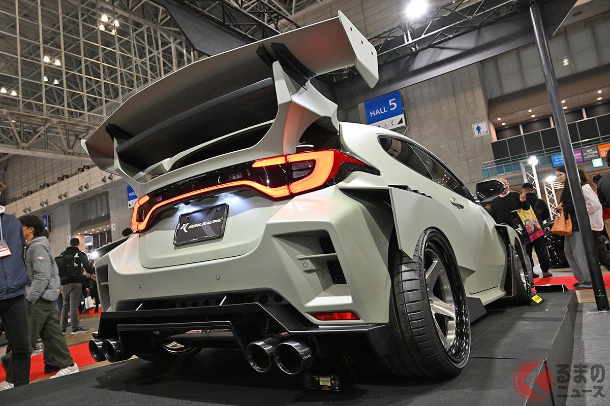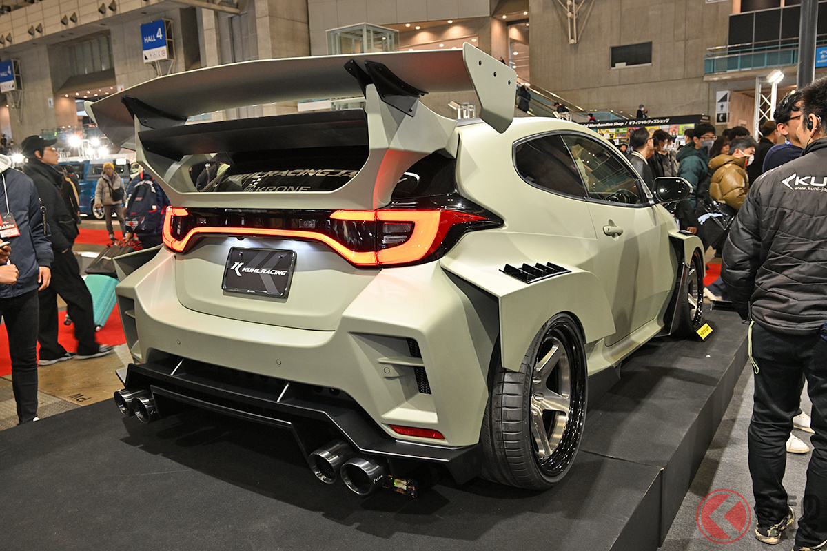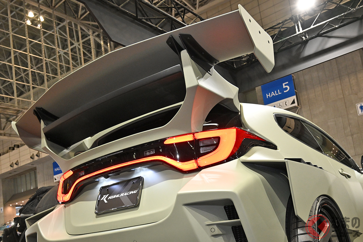 「スゴい“ウイング”…!」迫力あり過ぎ「GRヤリス」に目がテン! カクカクデザインの「超・拡大ボディ」がめちゃカッコいい! KUHLレーシング「SPEC-D ワイドボディ」カスタムに“熱視線”集まる