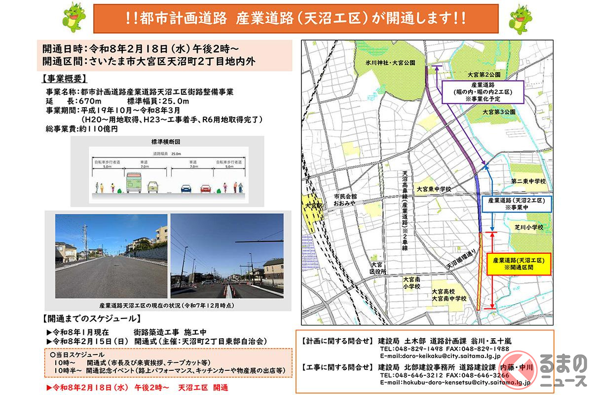 さいたま市は、都市計画道路「産業道路(天沼工区)」を2026年2月18日に開通させます。大宮エリアの南北を結ぶこの約670mのバイパス整備により、現道の慢性的な渋滞緩和や防災機能の向上が期待されます。4車線化された新たな道路は、地域交通の円滑化に寄与することになります。