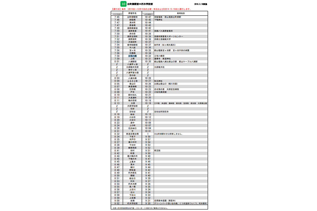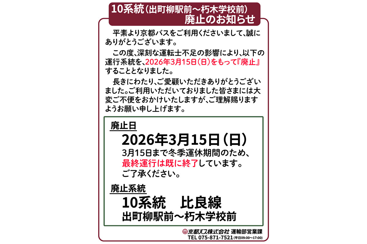 京都バスは2026年3月15日で10系統(出町柳駅前~朽木学校前)を廃止すると発表しました。