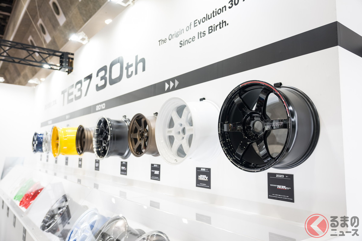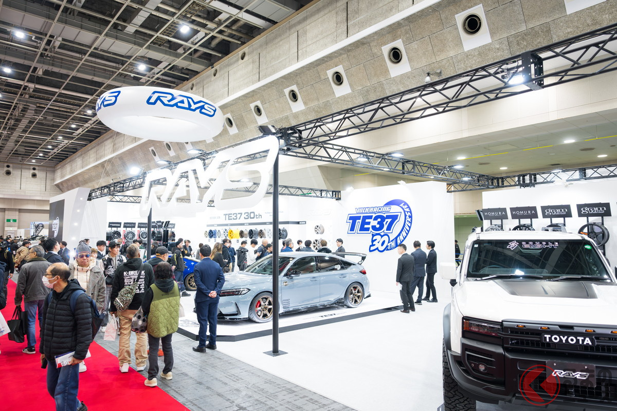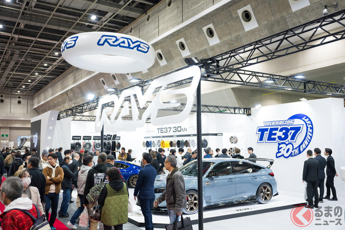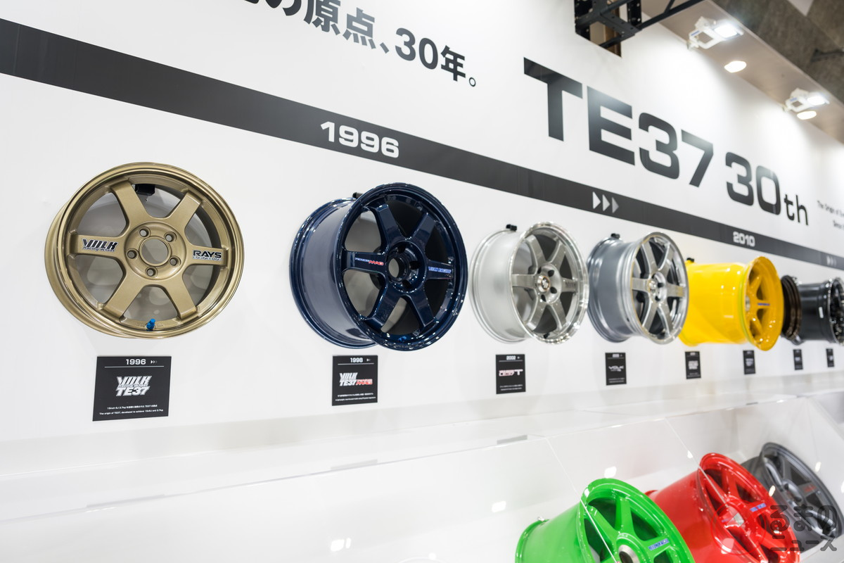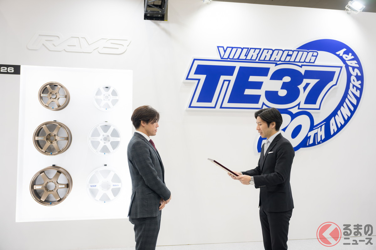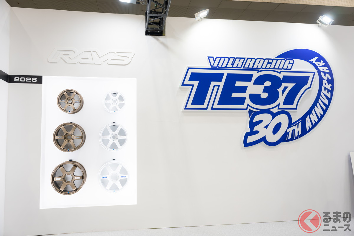 インテックス大阪で開催されたカスタマイズカーのイベント「大阪オートメッセ2026」に、ホイールメーカーのレイズが出展しました。歴代のTE37シリーズが多数展示されるなか、このTE37にちなんだサプライズ発表がありました。