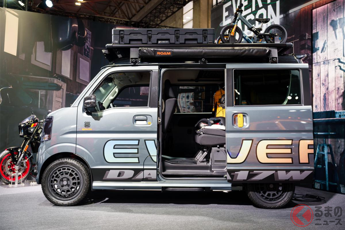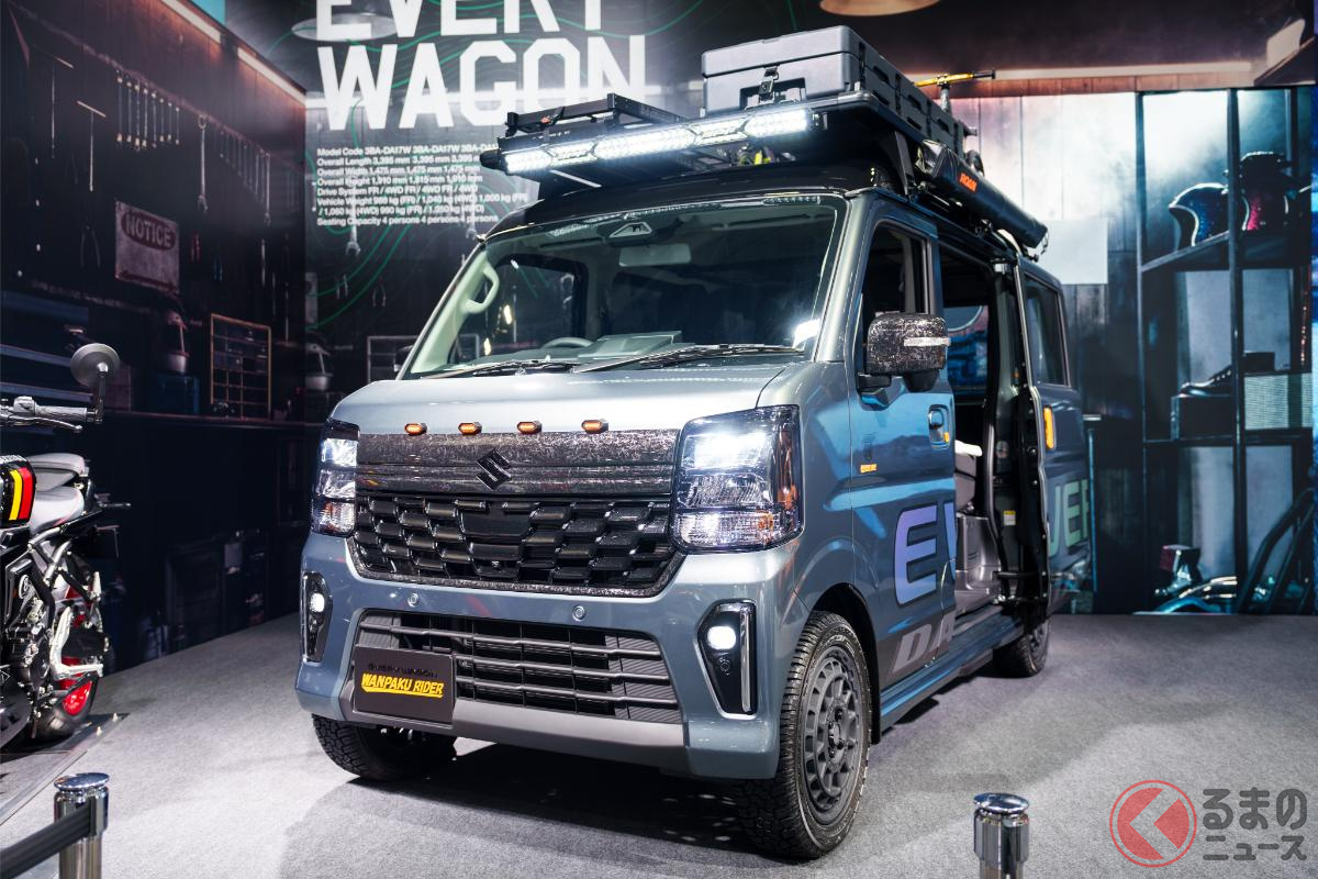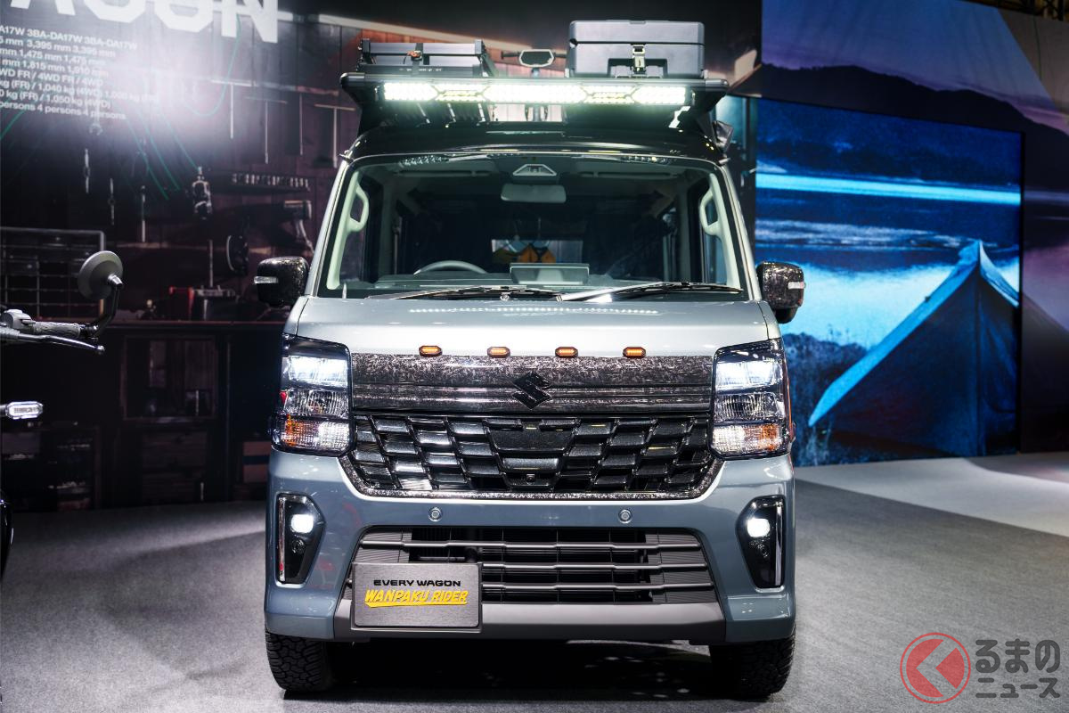 10年ぶり大刷新!? スズキ新型「エブリイ」公開!? デカグリル採用で「迫力顔」に? 先進安全装備も大進化? 未来を占う「EVERY WAGON WANPAKU RIDER」とは