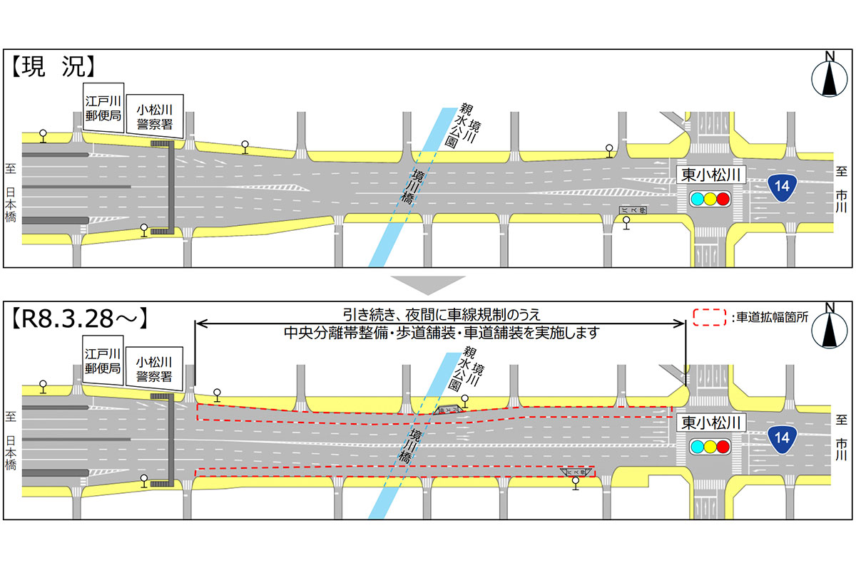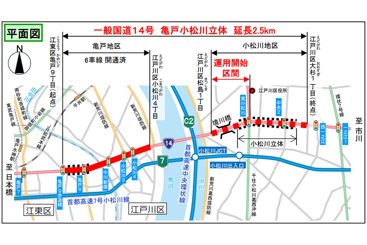 国土交通省 首都国道事務所は国道14号のうち、小松川警察署から東小松川交差点間の延長380mが6車線化されると発表しました。