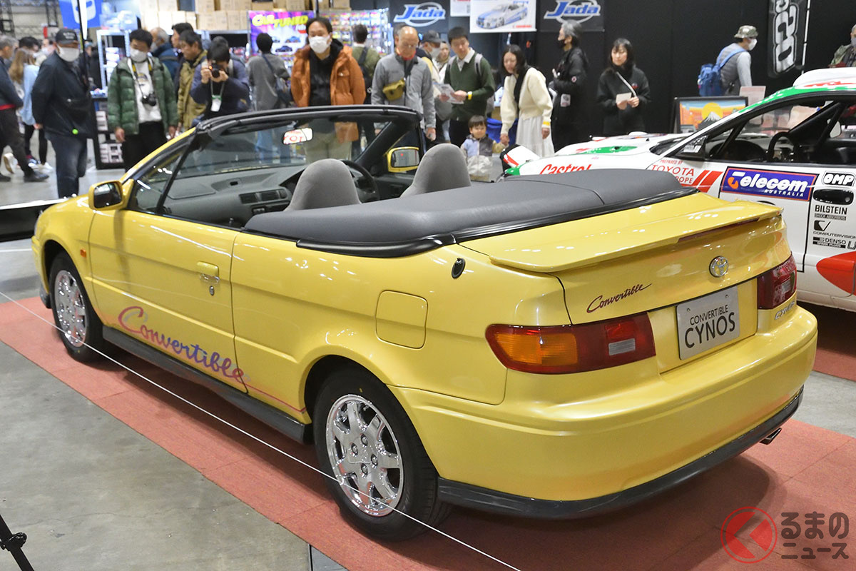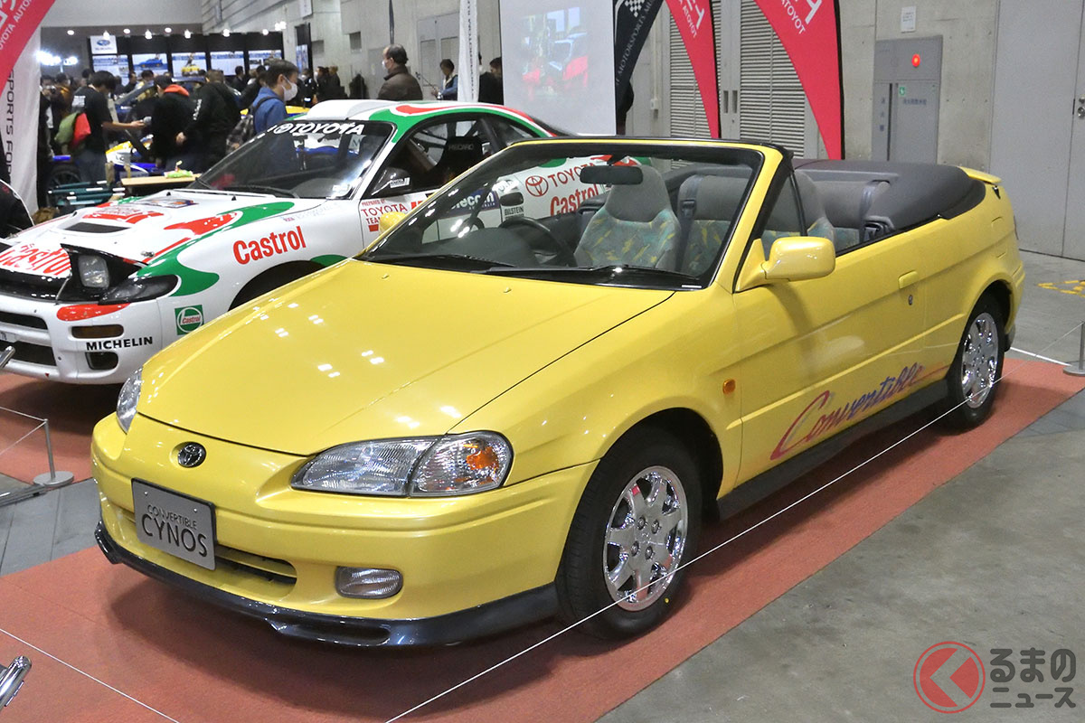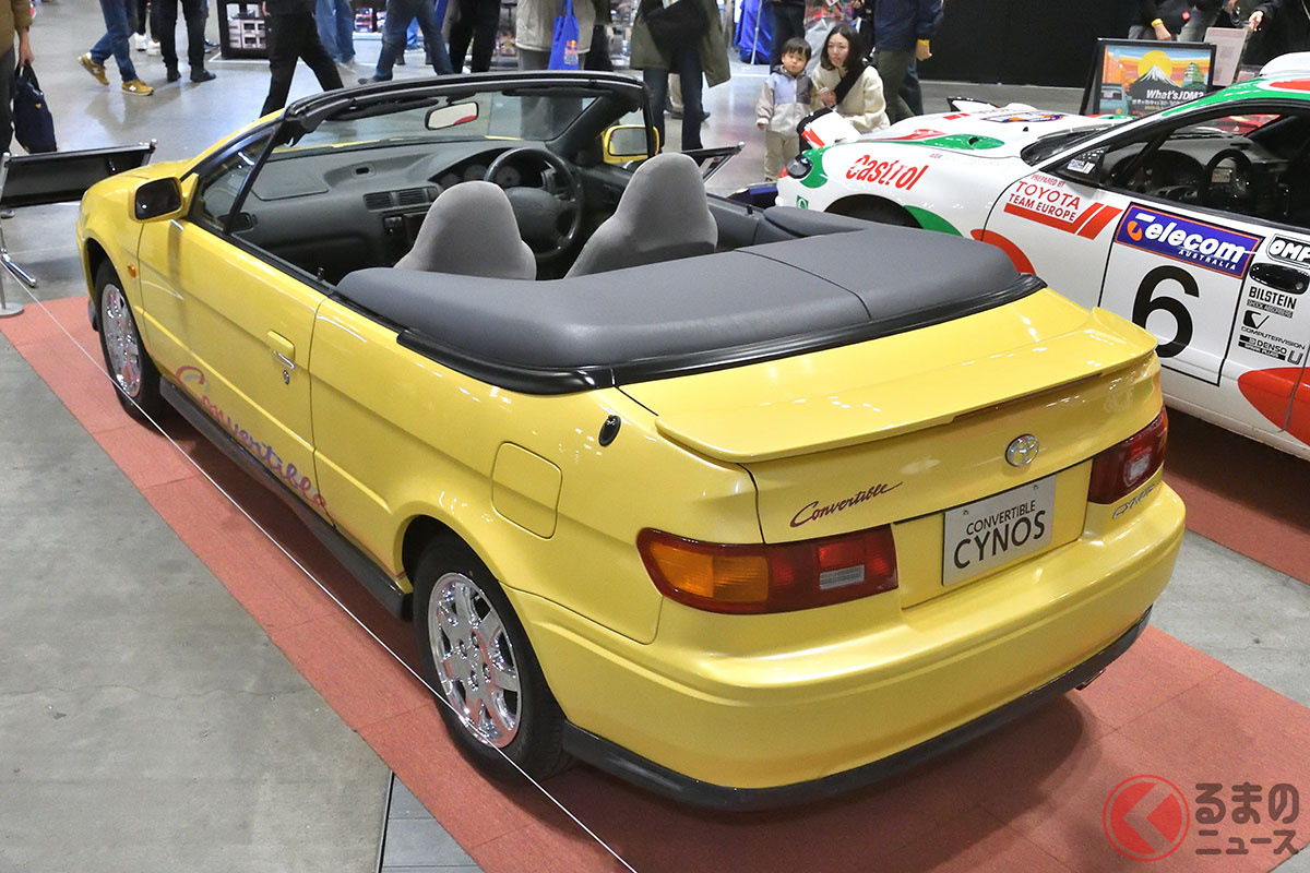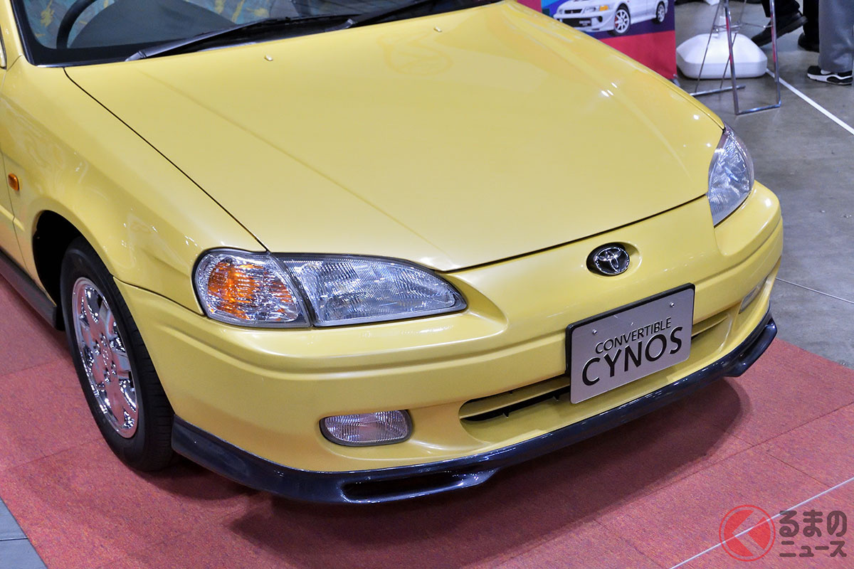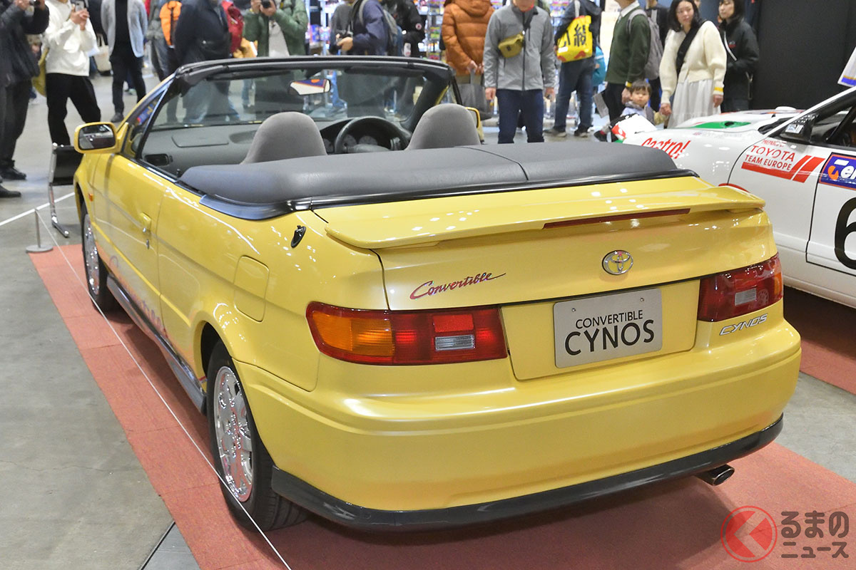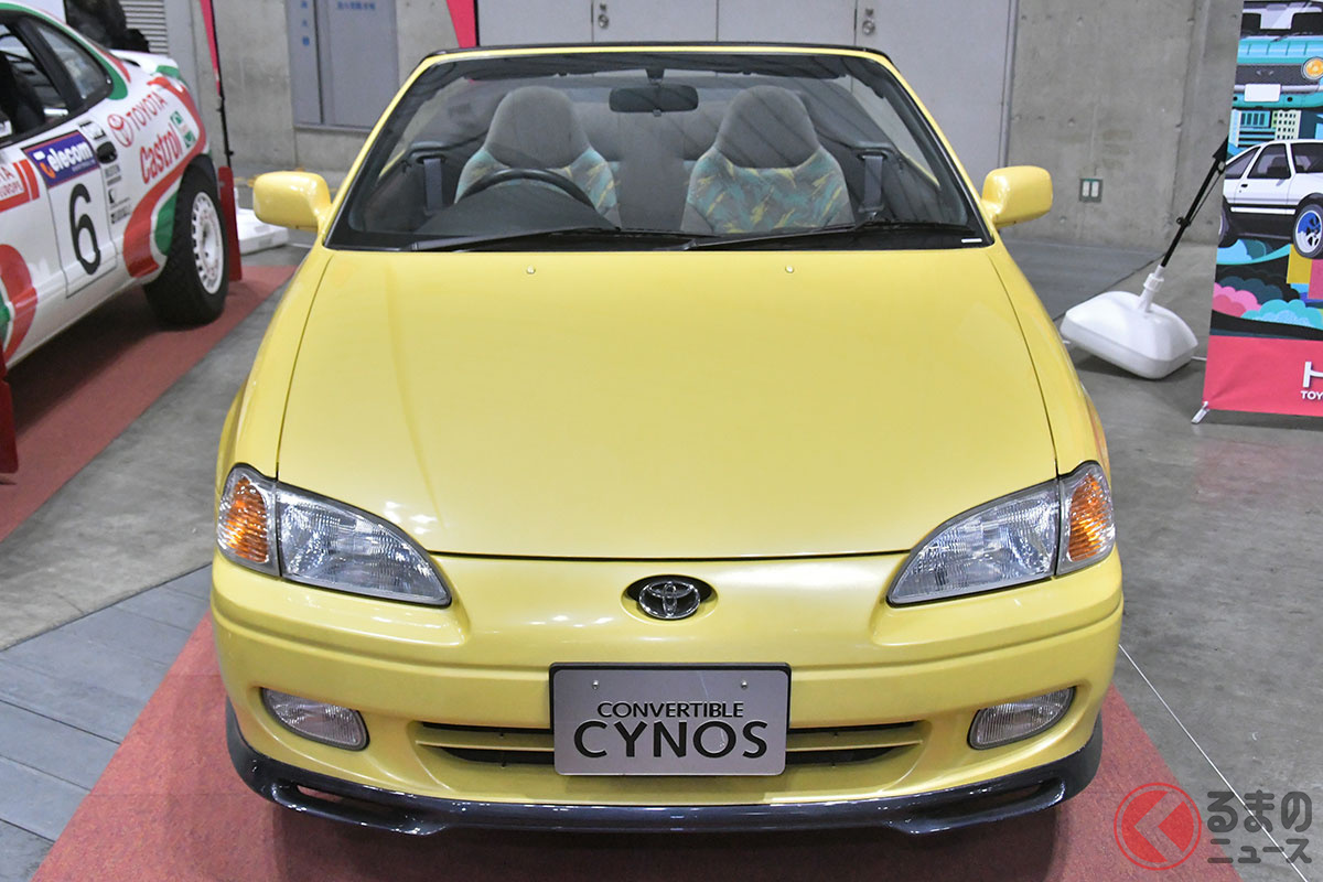 新車当時160万円! トヨタ斬新「黄色い2ドアオープンカー」実車展示! 全長4.1mの「手頃ボディ」で若者も再注目! 30年ぶりに姿を現した「95年式のサイノスコンバーチブル」に熱視線集まる