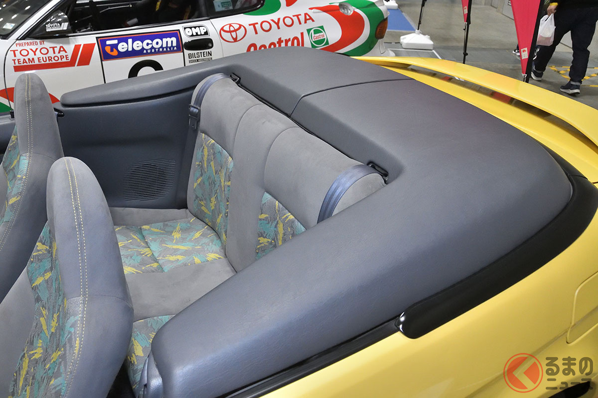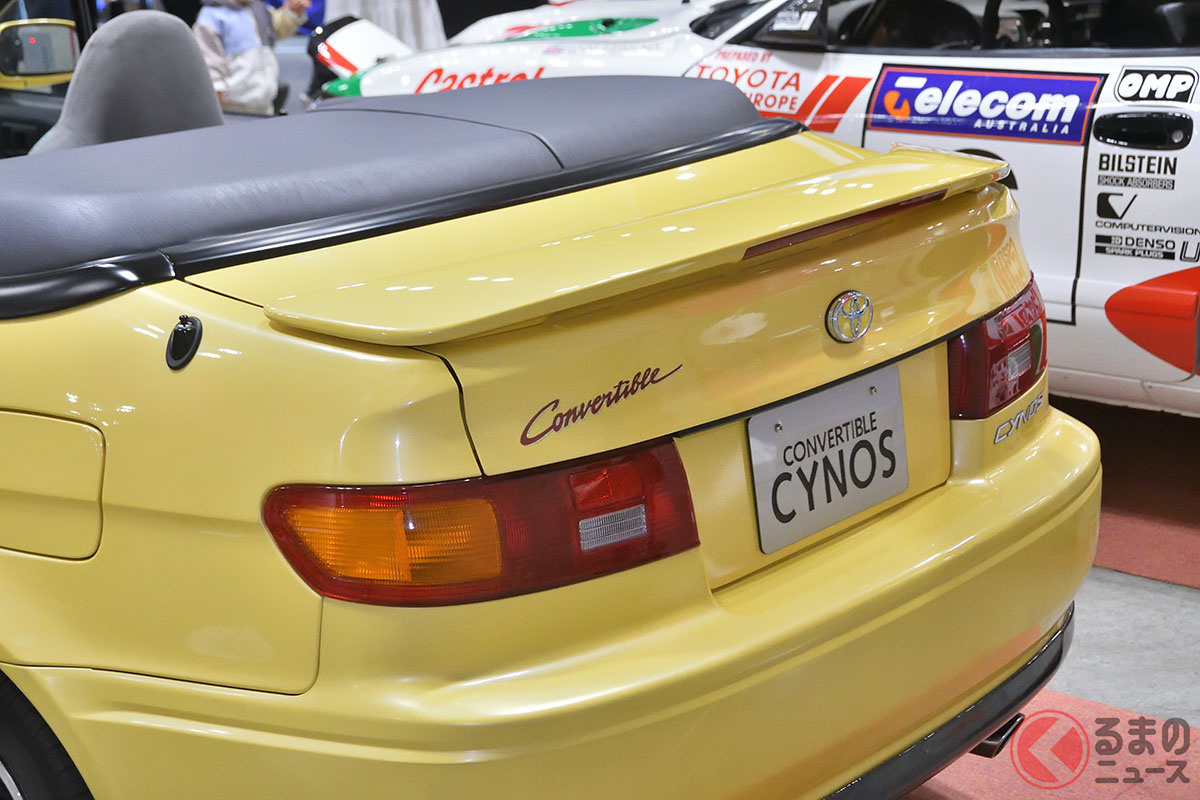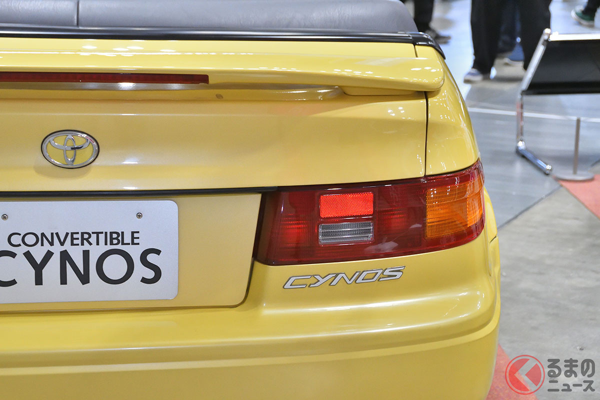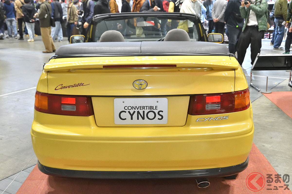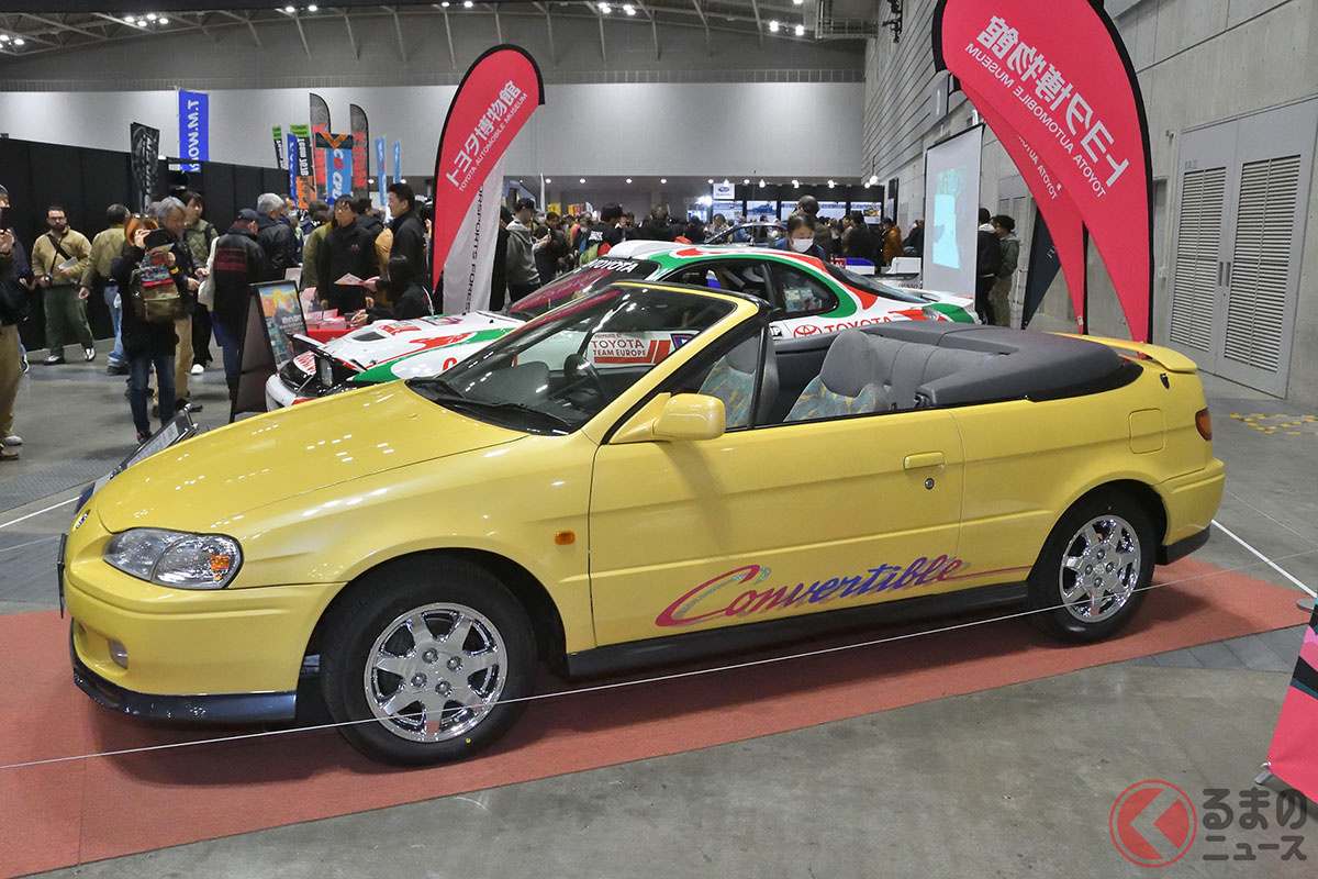 新車当時160万円! トヨタ斬新「黄色い2ドアオープンカー」実車展示! 全長4.1mの「手頃ボディ」で若者も再注目! 30年ぶりに姿を現した「95年式のサイノスコンバーチブル」に熱視線集まる
