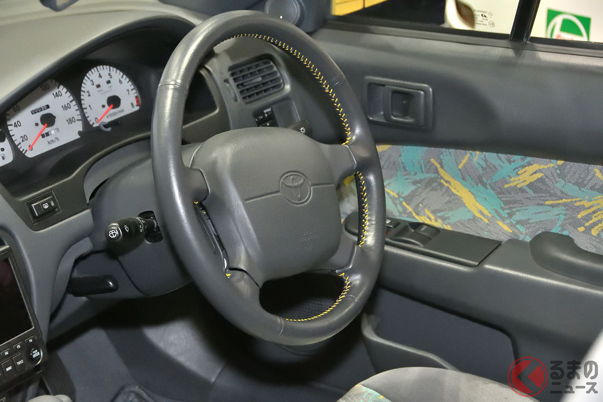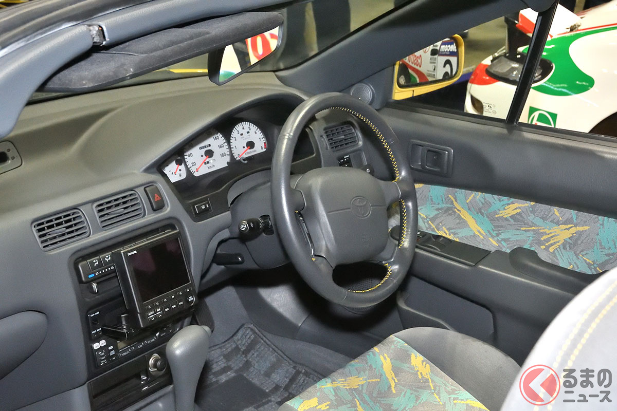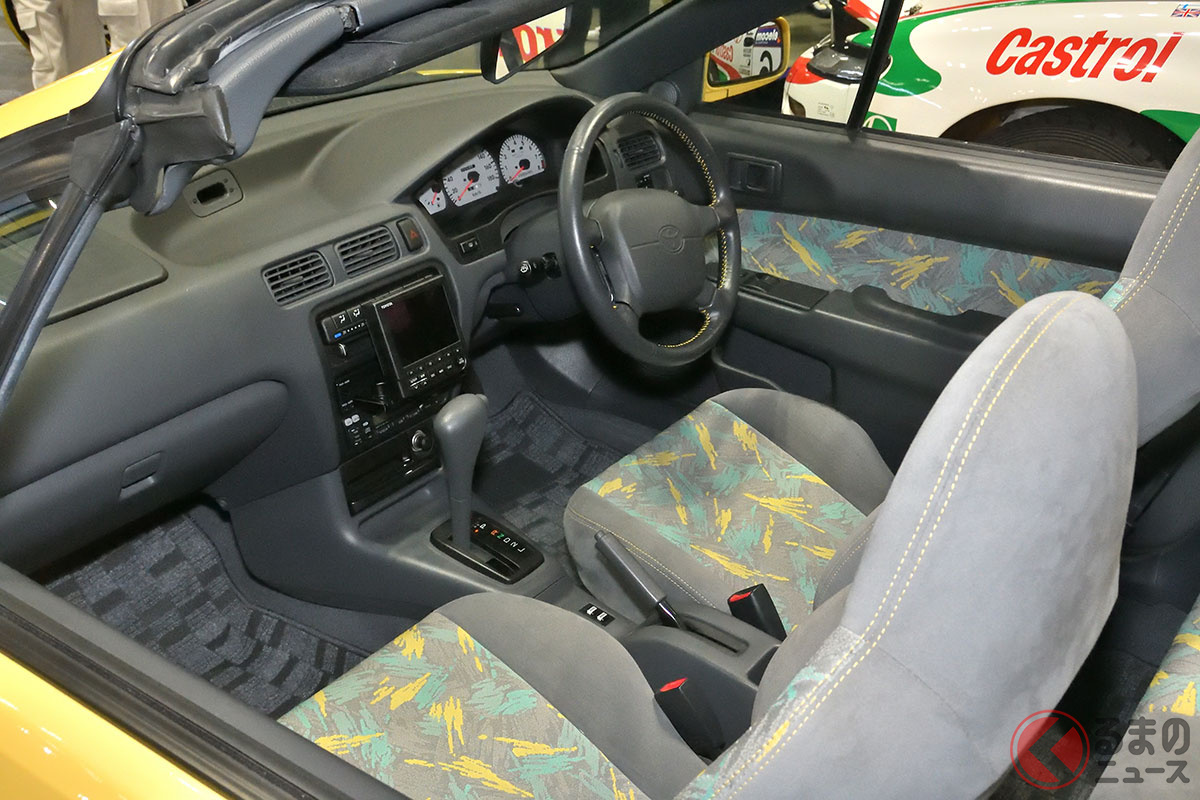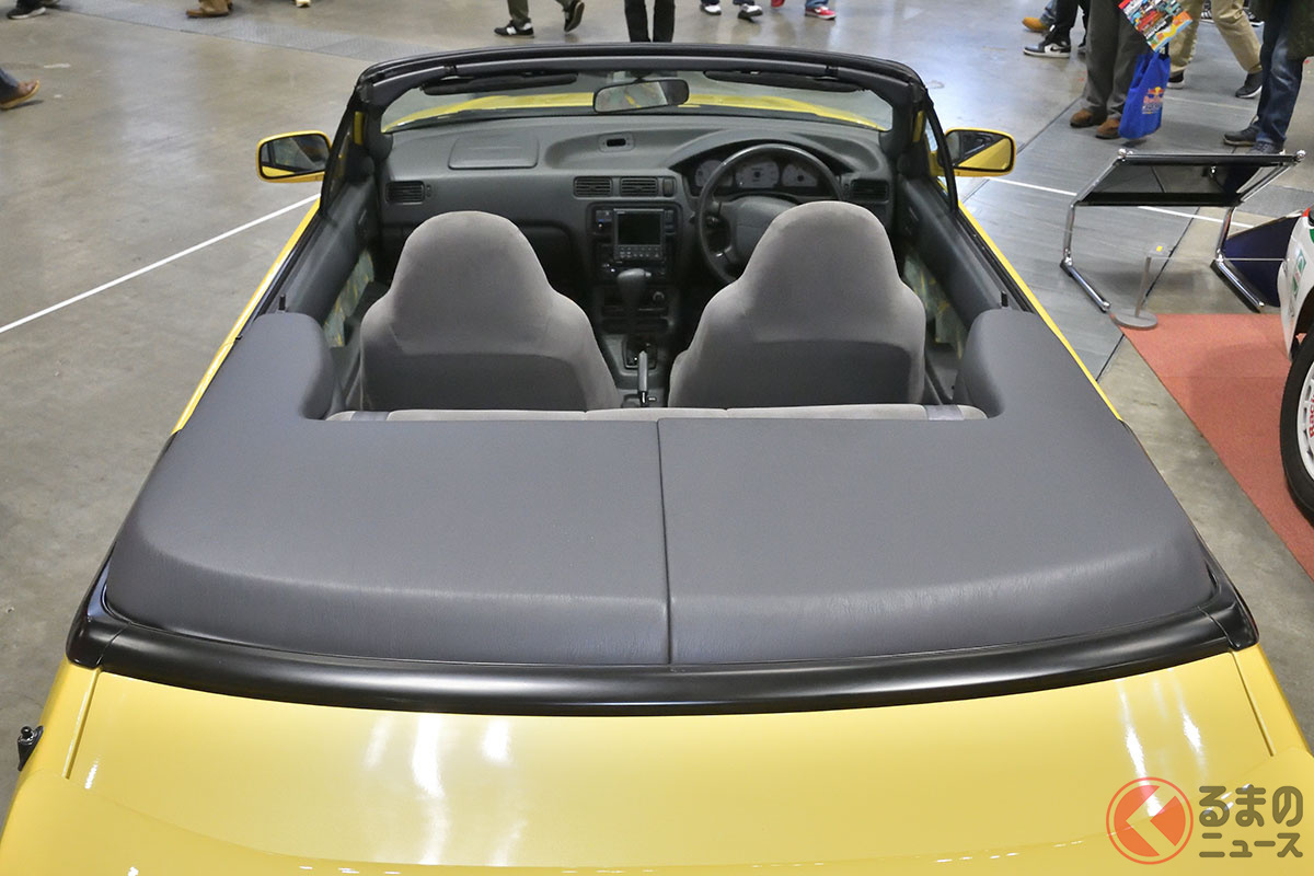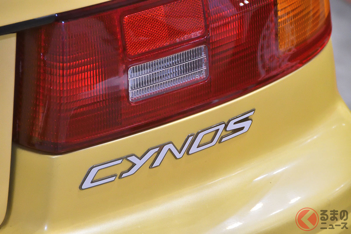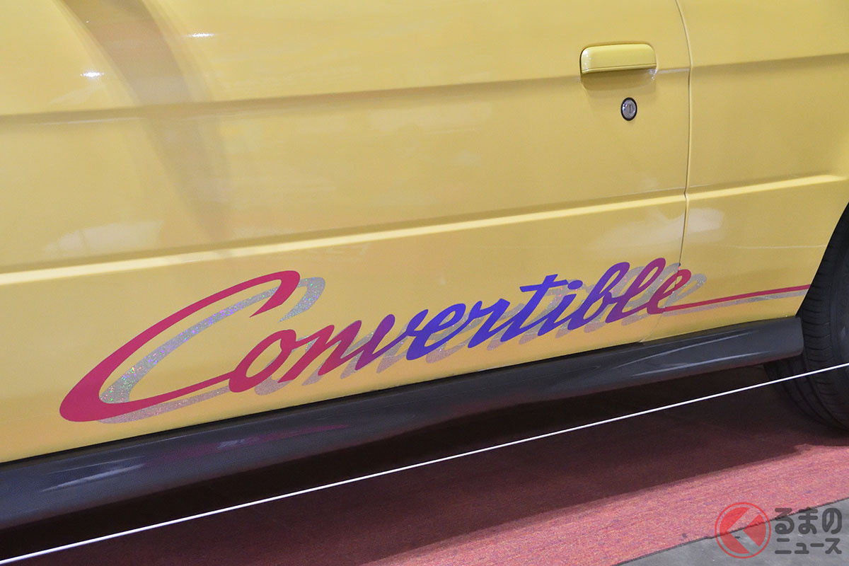 新車当時160万円! トヨタ斬新「黄色い2ドアオープンカー」実車展示! 全長4.1mの「手頃ボディ」で若者も再注目! 30年ぶりに姿を現した「95年式のサイノスコンバーチブル」に熱視線集まる