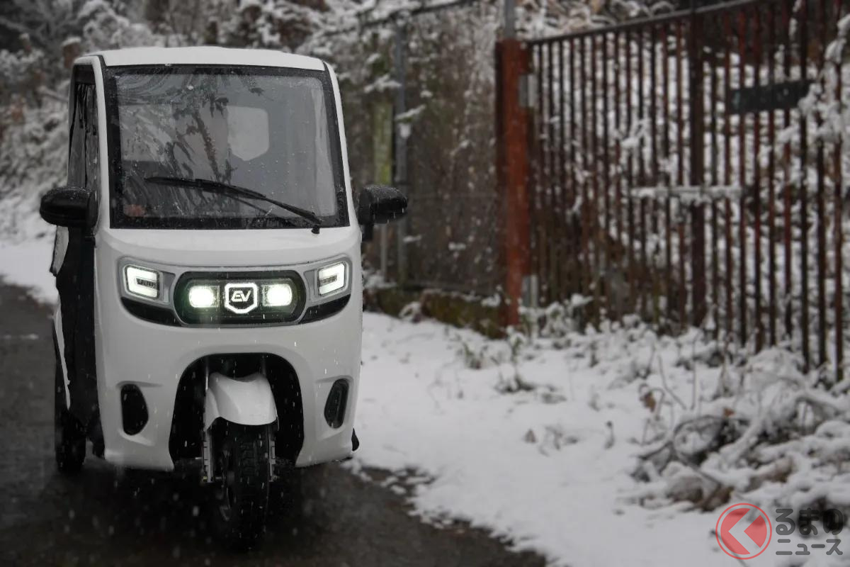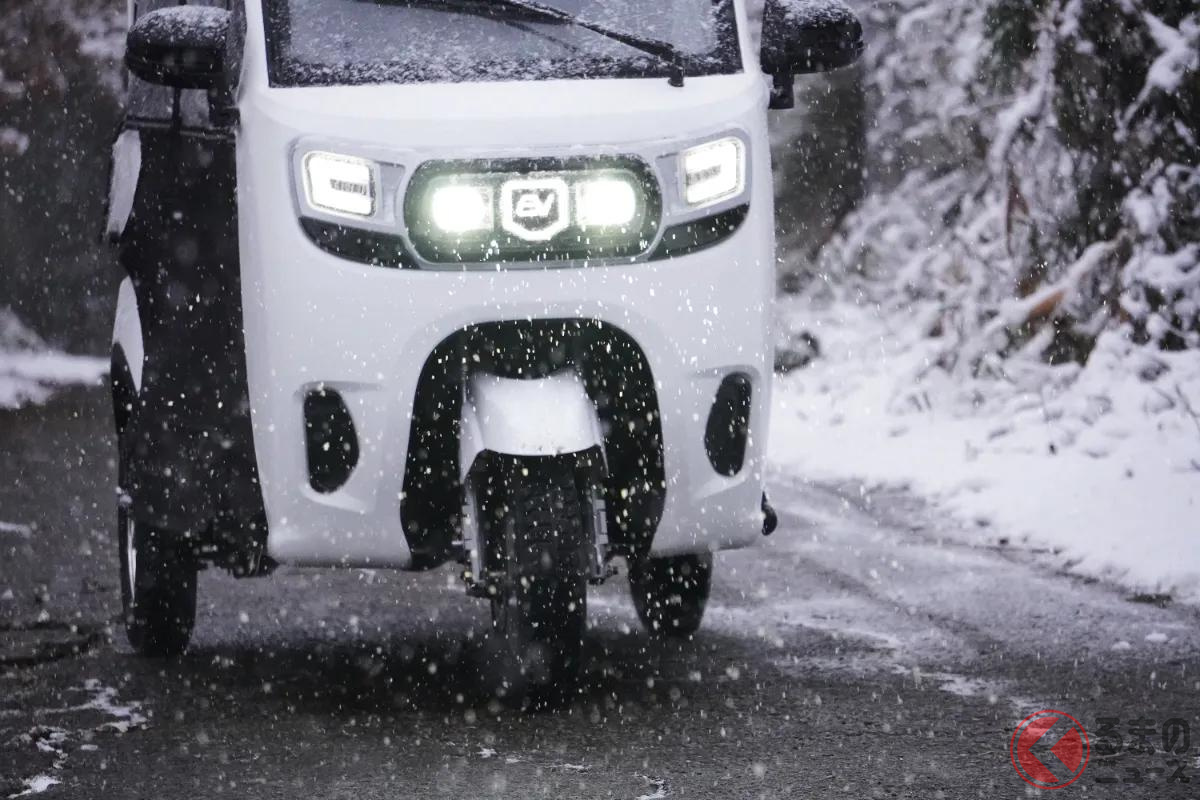 新車69万円! “3人乗り”の「トライク」がイイ! 車検“不要”&「クルマの免許」で乗れる! 軽より小さいボディの「ビベルトライク」に“スタッドレス”登場
