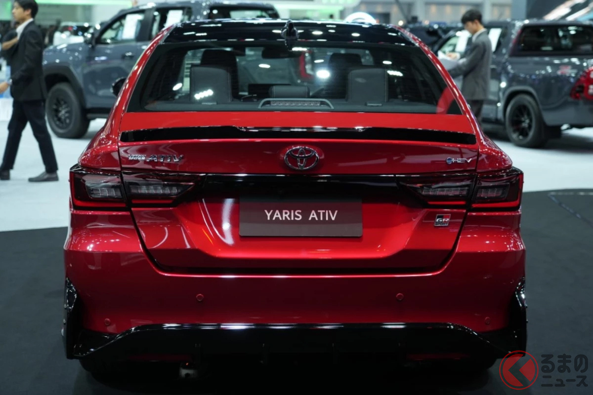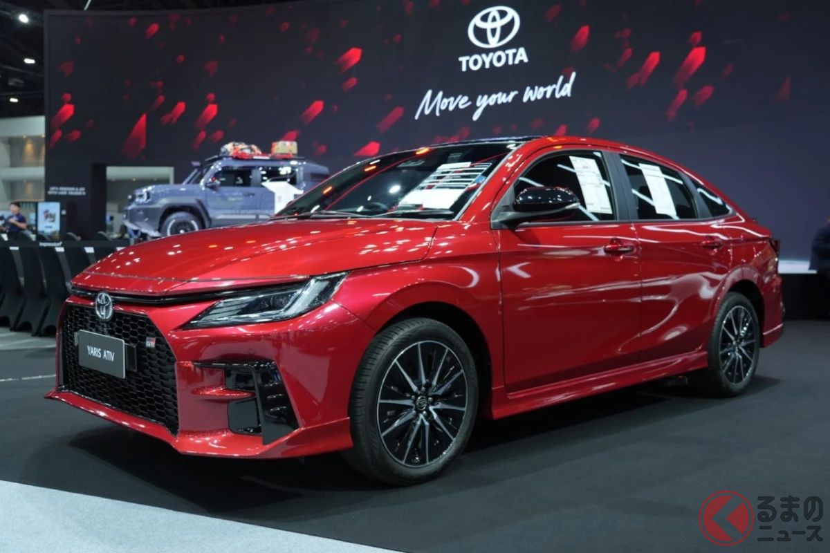 トヨタ新「コンパクトセダン」登場! 全長4.4m“ちょうどいいボディ”に「GR」仕立ての“専用デザイン”&チューニング採用! スポーティな内装もグッドな「ヤリス ATIV HEV GRスポーツ」タイで実車展示!