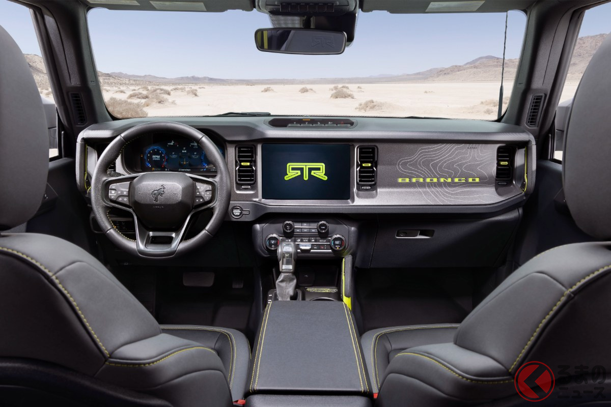 「300馬力」の2.3リッターターボ搭載! 新型「カクカク“本格四駆”」公開! レトロ顔&走りの「専用サス」採用! “イエロー加飾”の専用内装も魅力なフォード「ブロンコ RTR」米国仕様とは