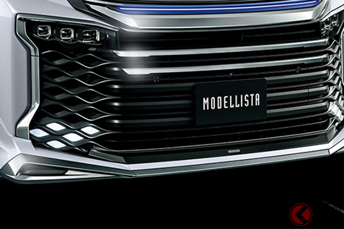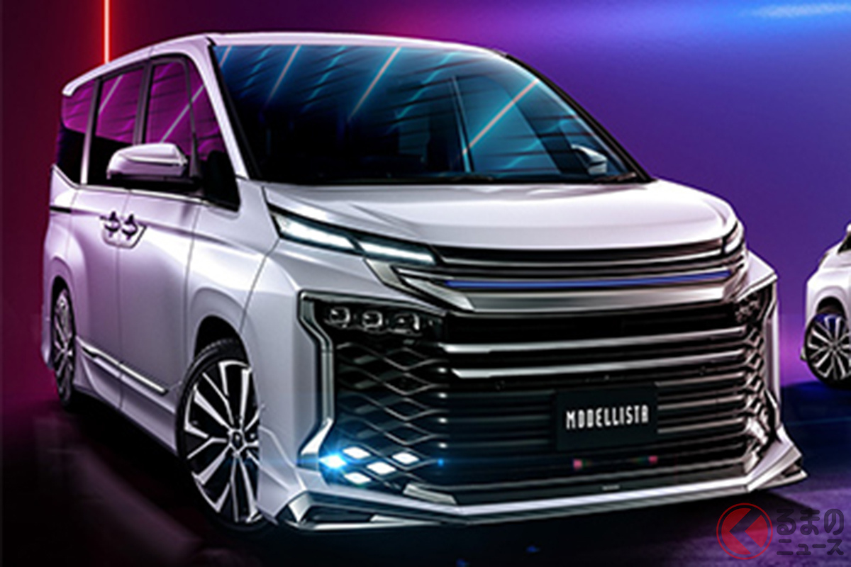 トヨタ新型「ヴォクシー」の“タフモデル”に注目! 「横一文字LED」&「大型メッキ」の重厚エアロが精悍! 刷新された「ブラックグリル」と融合するモデリスタ仕様とは