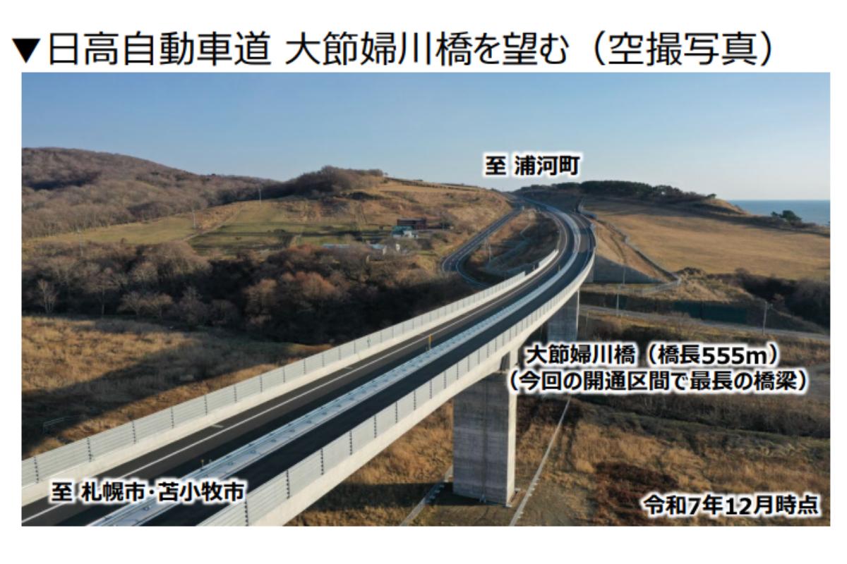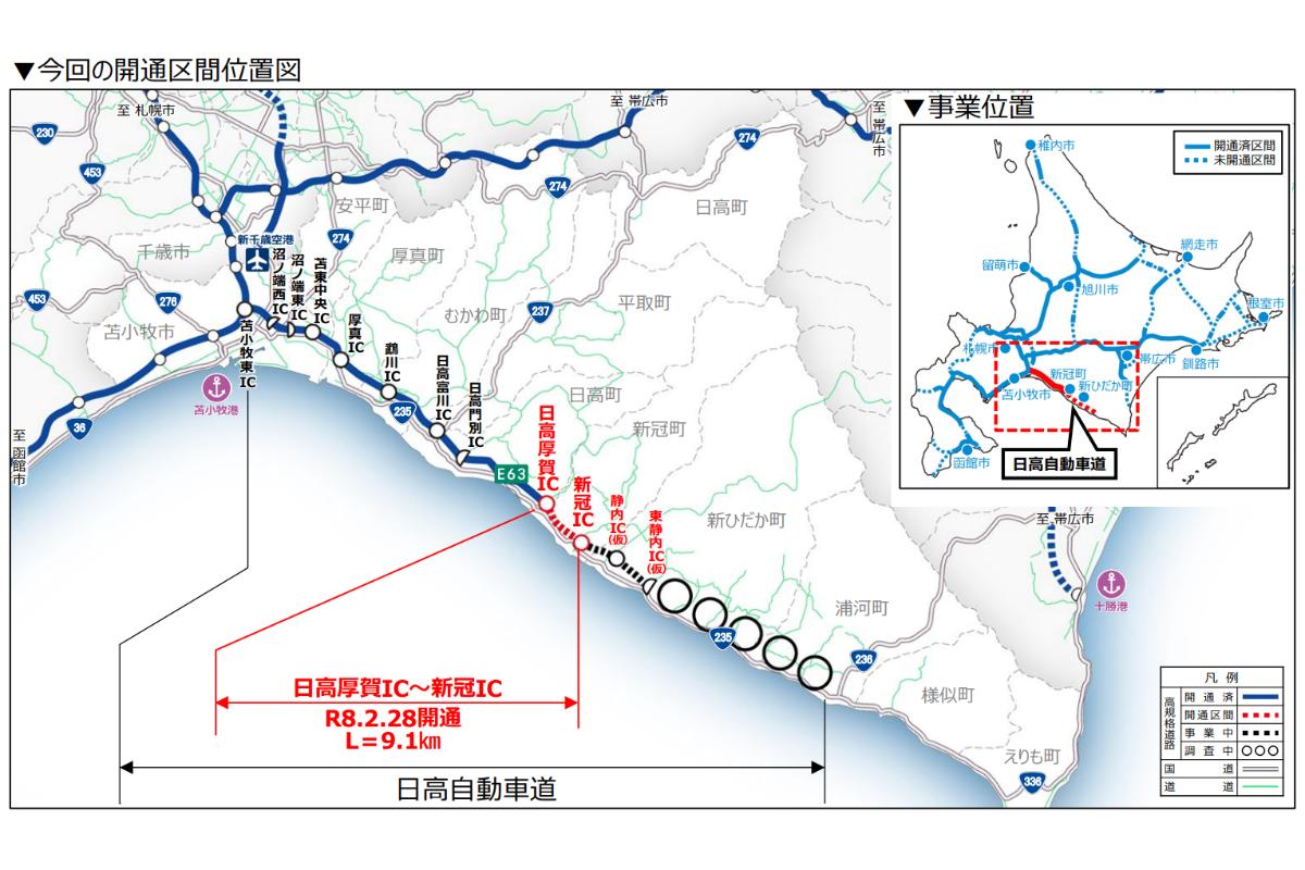 2026年2月28日、北海道で敷設工事が進められている自動車専用道路「日高自動車道」で、日高厚賀IC~新冠(にいかっぷ)IC間の延長9.1kmが開通を迎えました。